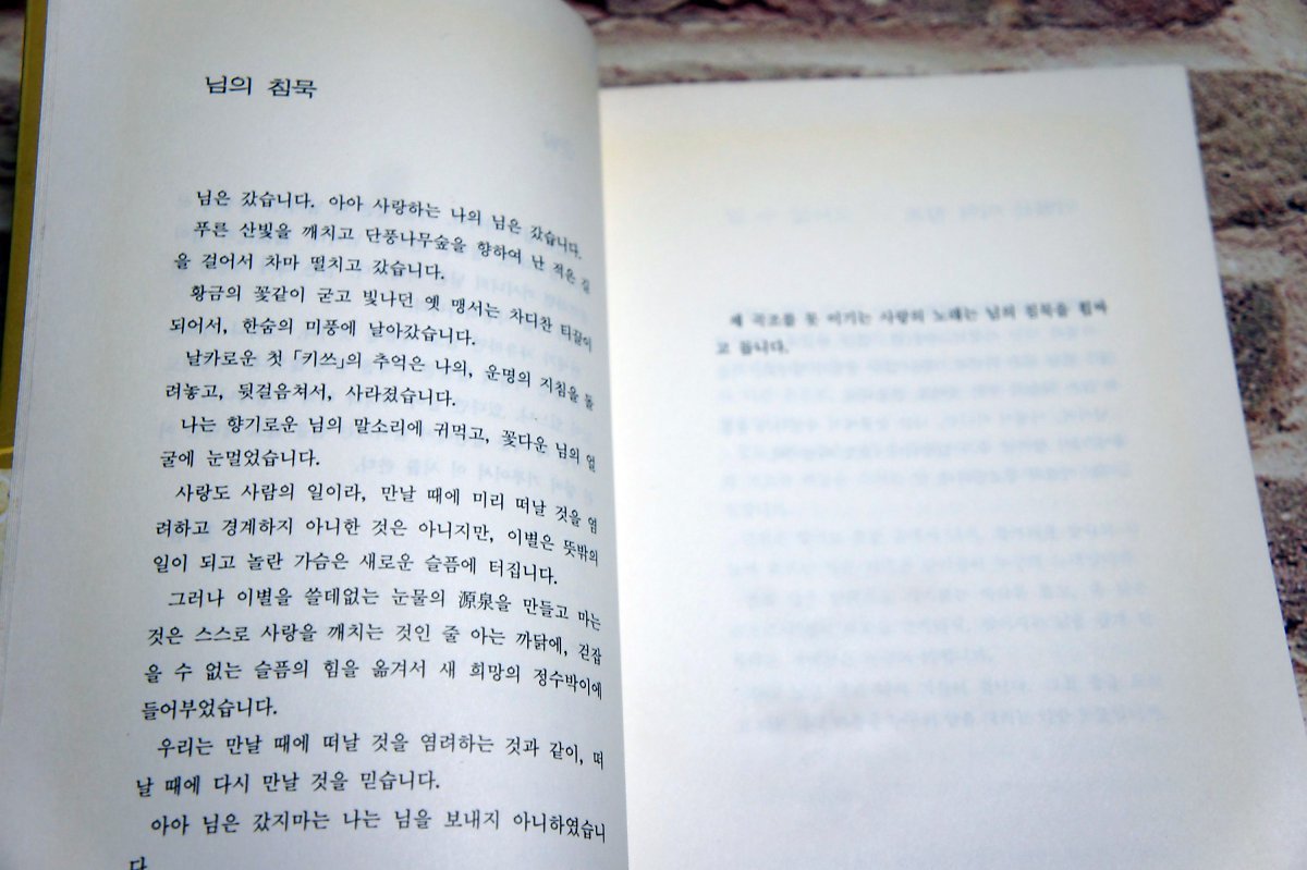 이제야 다시 한용운 시집을 꺼내들었다. 학창 시절에 외웠던 시는 한참 세월이 흐른 뒤에 꺼내들어도 기억나는 것이 신기하다. 오늘은 군말을 줄이고 시 감상의 시간을 더 가져보아야겠다.