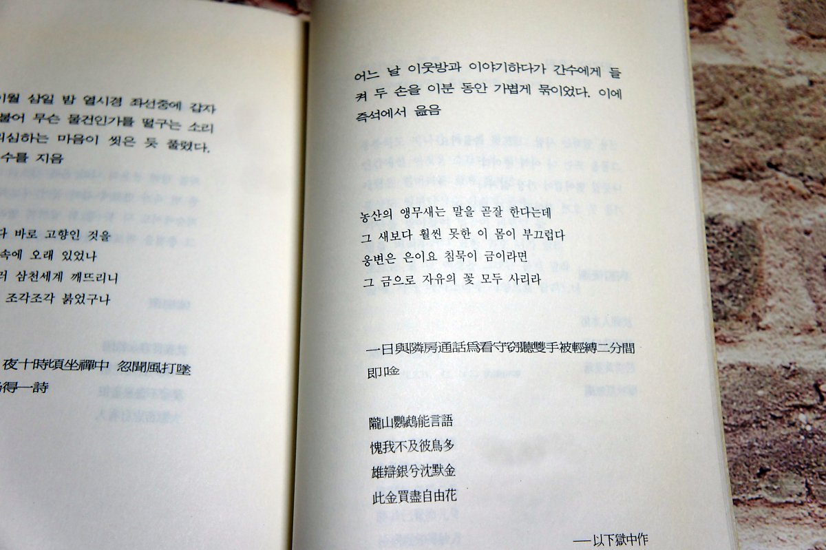 어느 날 이웃방과 이야기하다가 간수에게 들켜 두 손을 이분 동안 가볍게 묶이었다. 이에 즉석에서 읊음