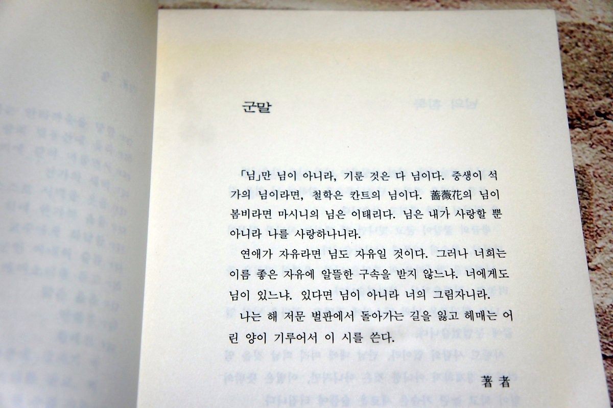 「님」만 님이 아니라, 기룬 것은 다 님이다. 중생이 석가의 님이라면, 철학은 칸트의 님이다. 장미화의 님이 봄비라면 마시니의 님은 이태리다. 님은 내가 사랑할 뿐 아니라 나를 사랑하나니라.