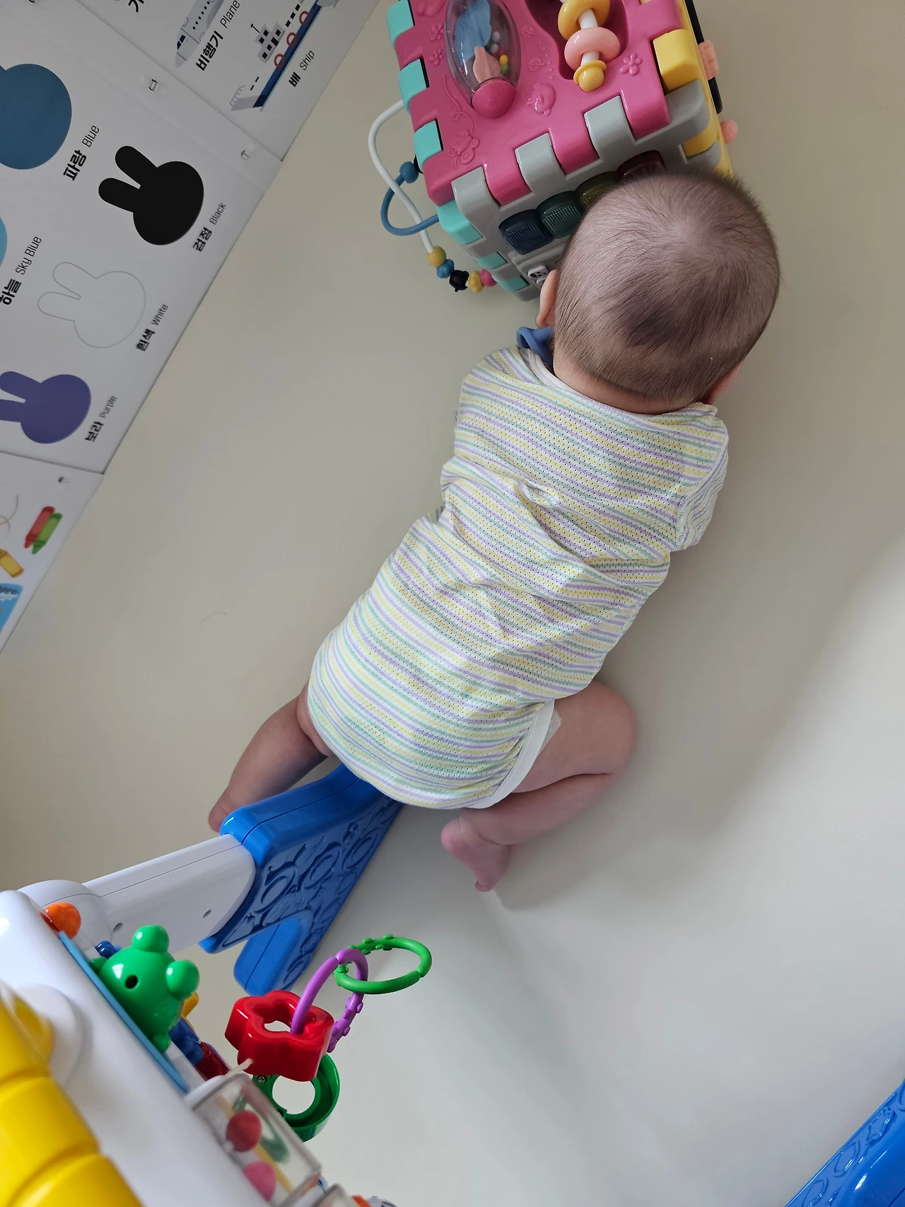 아기는 자꾸 뒤집기를 하고 싶은데, 마음대로 뭐가 안 되니 짜증 섞인 울음과 끙끙 소리를 냈다. 나는 그 모습이 좀 안쓰러웠다.