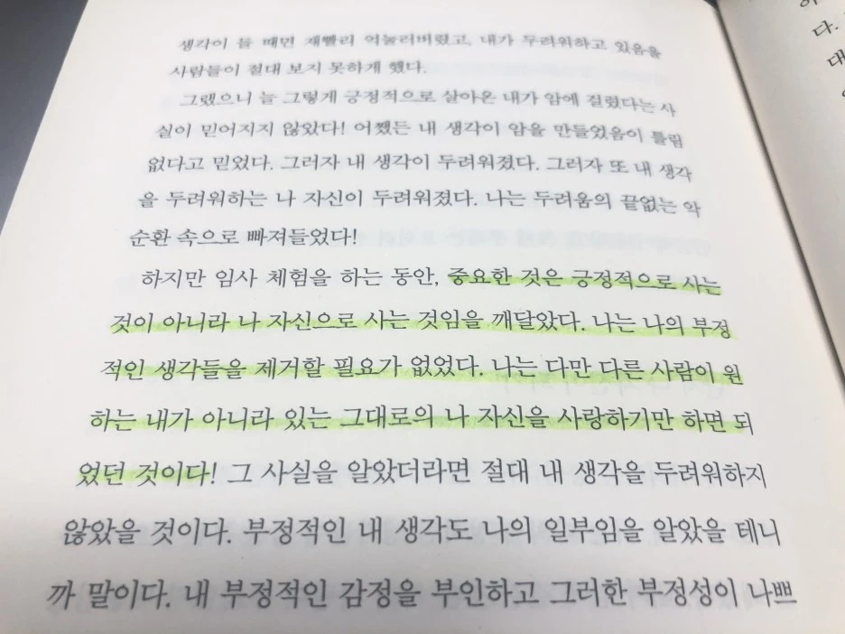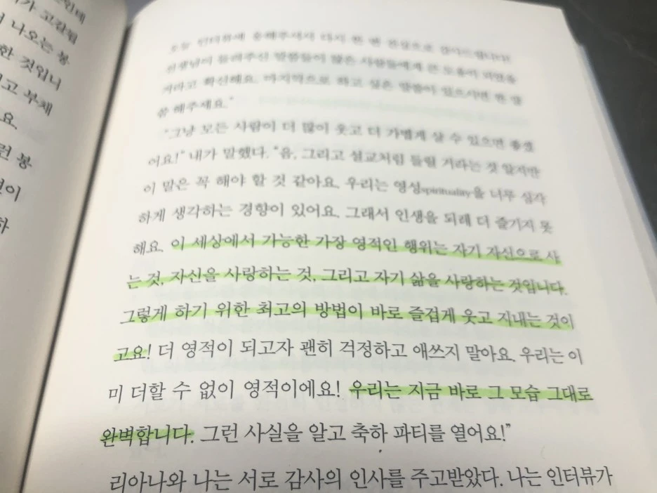 김새해 북튜버의 추천으로 읽고 있다. 임사체험을 한 본인의 독특한 경험을 바탕으로 세계적으로 저술과 강연 활동을 하는 작가이다. 긍정적으로 사는 것보다 더 중요한 것은 나 자신으로 사는 것이다, 우리의 존재 자체가 사랑이다, 나 자신을 있는 그대로 받아들이고 사랑하라 등등 정말 좋은 내용들이 많다.