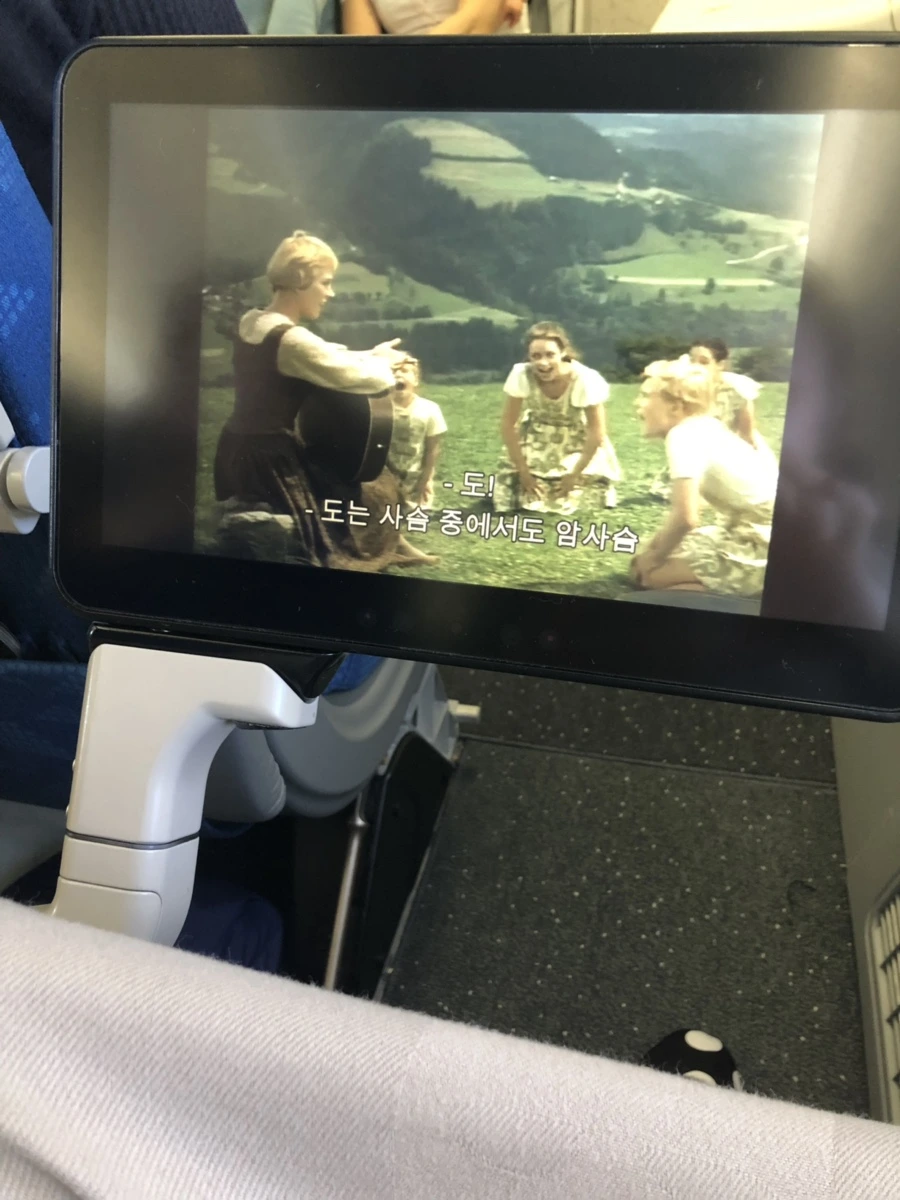 고전영화 중에 명작 <사운드 오브 뮤직>이 있길래 또 감탄하며 좋은 노래가 나오는 부분만 빨리 감기 하며 보았다. (착륙이 얼마 남지 않았기 때문에...) 예전에 보고 너무나도 좋아서 OST 음원 다 다운로드하고, 영어 가사까지 프린트해서 따라 부르고 외울 정도로 좋아했던 영화이다. 다시 봐도 음악이 정말 아름답다. 두 아이의 엄마가 되어 보니 7남매들의 모습도 새롭게 보인다.