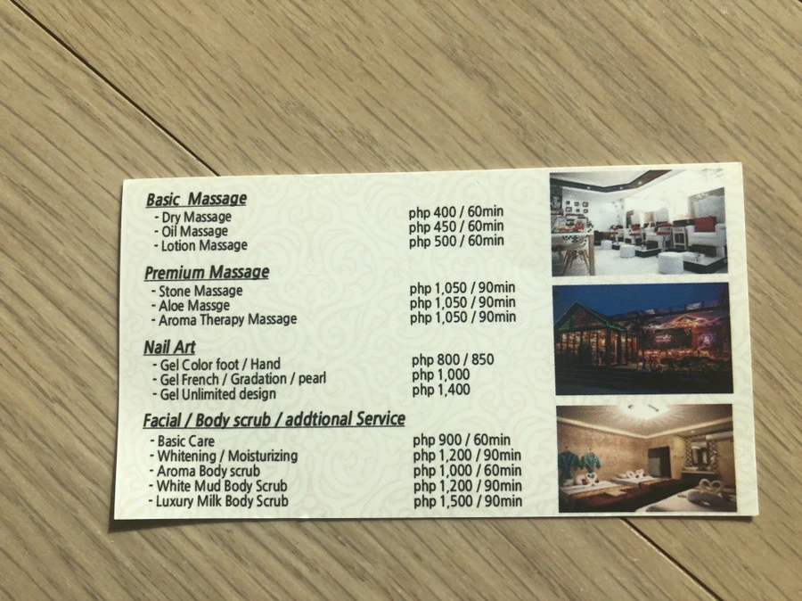 나는 마사지샵 특유의 릴렉싱 한 느낌과 특유의 향기, 어두운 조명, 은은한 음악이 참 좋다. 마사지를 기다리며 누워있는데 내 마사지 인생(?)이 주마등처럼 머릿속에 떠올랐다. 어디가 가장 좋았을까 생각해보니 넘버 원은 비행하며 받은 곳이 아니라, 약 6-7년 전쯤 휴가 때 세부로 스쿠버 다이빙하러 왔을 때 받은 마사지가 최고였다.