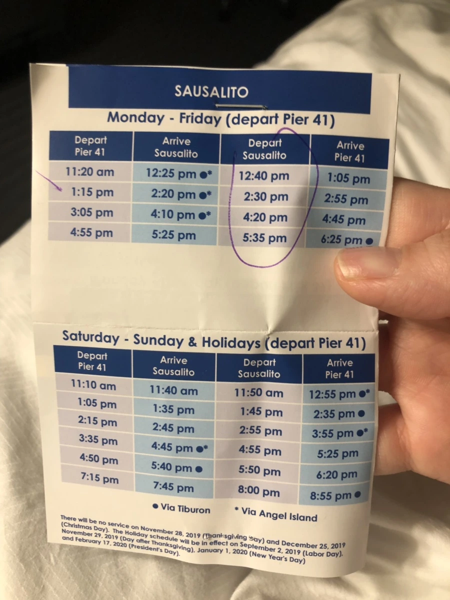 덕분에 유명한 브런치 카페에서 맛있는 아침식사를 한 후 천천히 Pier 39으로 이동해 소살리토로 가는 크루즈 티켓을 구입했다. 왕복에 $26이었다. 우리는 1시 15분 배를 탔는데 앤젤 아일랜드와 티브론이라는 섬을 찍고 마지막에 소살리토에 도착해 거의 1시간이 걸렸다. (다시 Pier 39로 올 때는 직행이라 30분이 채 안 걸렸다) 그래도 시원한 바닷바람을 맞으며 멋진 금문교와 다운타운 스카이라인을 감상하니 그냥 크루즈에 앉아있는 것만으로도 힐링이었다.