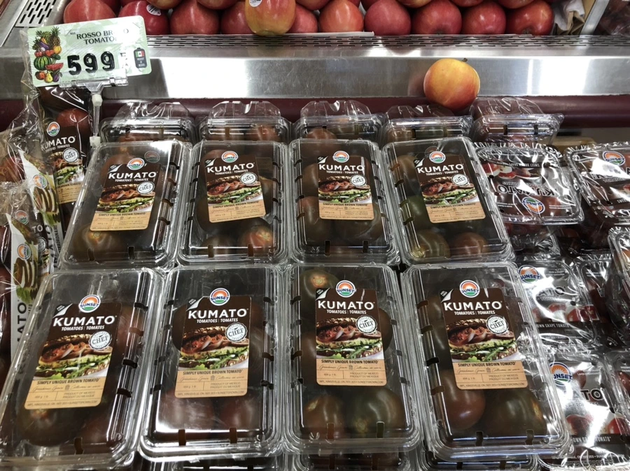처음 본 과일이라 찍은 쿠마토. 찾아보니 흑토마토라고 한다. 일반 토마토보다 항산화물질 함량이 더 높다고 한다. 얼마 전에는 솜사탕맛 포도 (cotton candy grapes)를 팔길래 먹어보니 정말 솜사탕 향이 나서 깜짝 놀란 적이 있었는데 마트에는 늘 재미있는 것들이 많다.