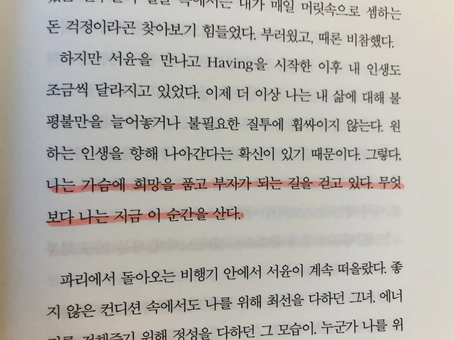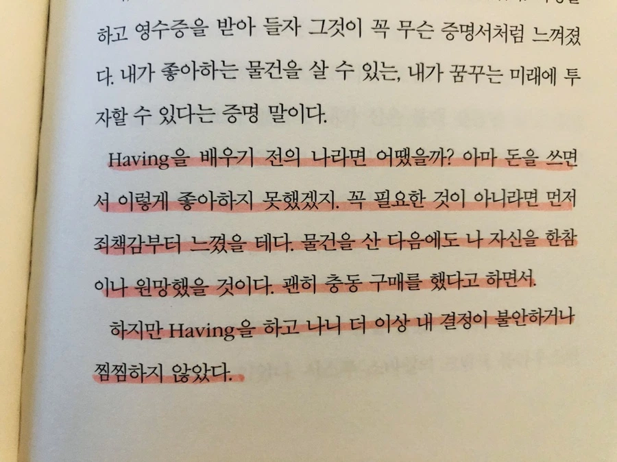 Having을 배우기 전의 나라면 어땠을까? 아마 돈을 쓰면서 이렇게 좋아하지 못했겠지. 꼭 필요한 것이 아니라면 먼저 죄책감부터 느꼈을 테다. 물건을 산 다음에도 나 자신을 한참이나 원망했을 것이다. 괜히 충동 구매를 했다고 하면서. 하지만 Having을 하고 나니 더 이상 내 결정이 불안하거나 찜찜하지 않았다.