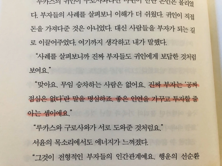 진짜 부자는 '공짜 점심은 없다'란 말을 명심하죠. 좋은 인연을 가꾸고 투자할 줄 아는 셈이에요.