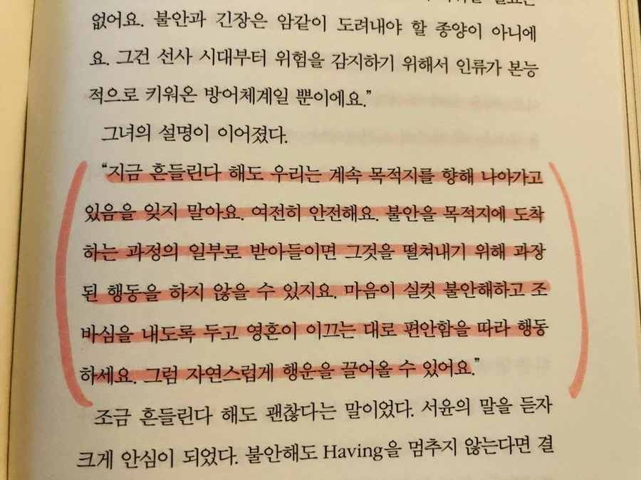 지금 흔들린다 해도 우리는 계속 목적지를 향해 나아가고 있음을 잊지 말아요. 여전히 안전해요. 불안을 목적지에 도착하는 과정의 일부로 받아들이면 그것을 떨쳐내기 위해 과장된 행동을 하지 않을 수 있지요. 마음이 실컷 불안해하고 조바심을 내도록 두고 영혼이 이끄는 대로 편안함을 따라 행동하세요. 그럼 자연스럽게 행운을 끌어올 수 있어요.