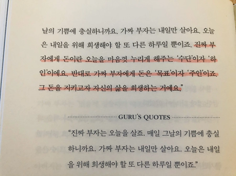 진짜 부자에게 돈이란 오늘을 마음껏 누리게 해주는 '수단'이자 '하인'이에요. 반대로 가짜 부자에게 돈은 '목표'이자 '주인'이죠. 그 돈을 지키고자 자신의 삶을 희생하는 거예요.