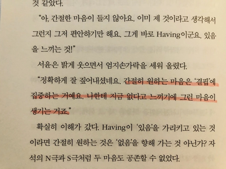 간절히 원하는 마음은 '결핍'에 집중하는 거예요. 나한테 지금 없다고 느끼기에 그런 마음이 생기는 거죠.