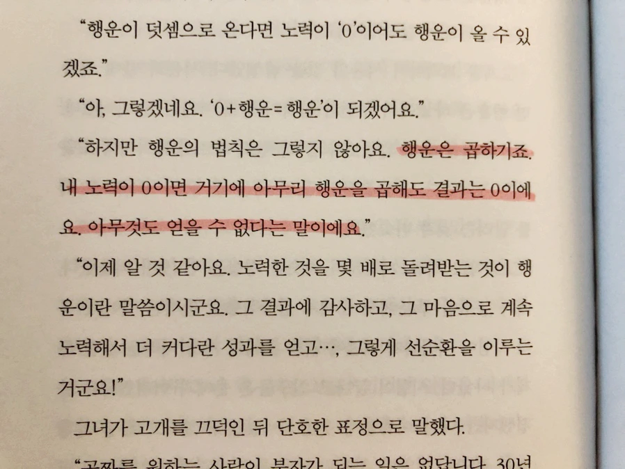 행운은 곱하기죠. 내 노력이 0이면 거기에 아무리 행운을 곱해도 결과는 0이에요. 아무것도 얻을 수 없다는 말이에요.