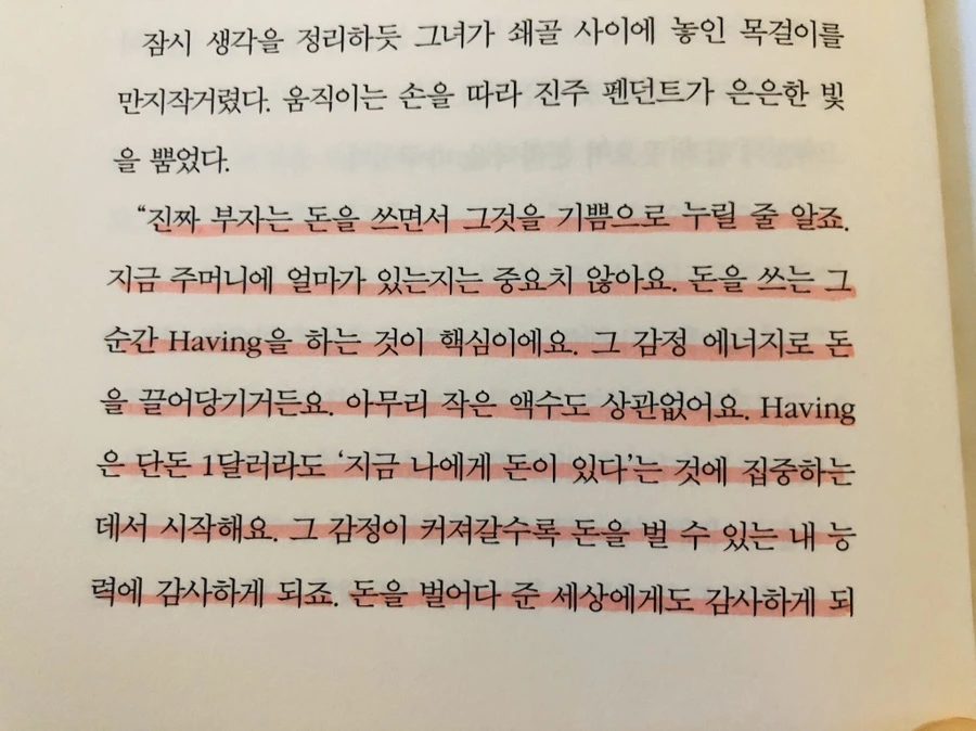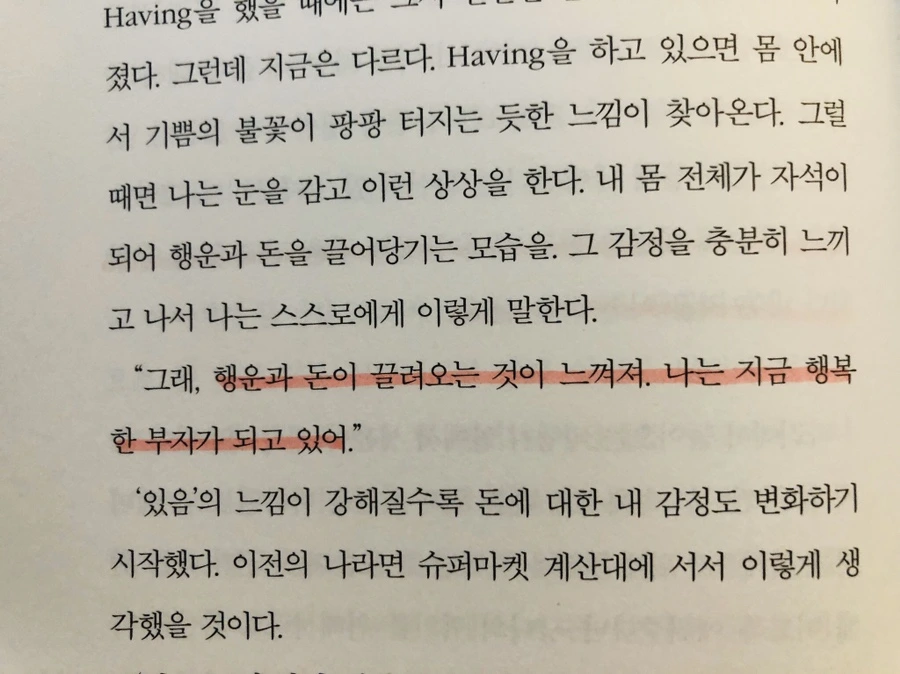 진짜 부자는 돈을 쓰면서 그것을 기쁨으로 누릴 줄 알죠. 지금 주머니에 얼마가 있는지는 중요치 않아요. 돈을 쓰는 그 순간 Having을 하는 것이 핵심이에요. 그 감정 에너지로 돈을 끌어당기거든요. 아무리 작은 액수도 상관없어요. Having은 단돈 1달러라도 '지금 나에게 돈이 있다'는 것에 집중하는 데서 시작해요.