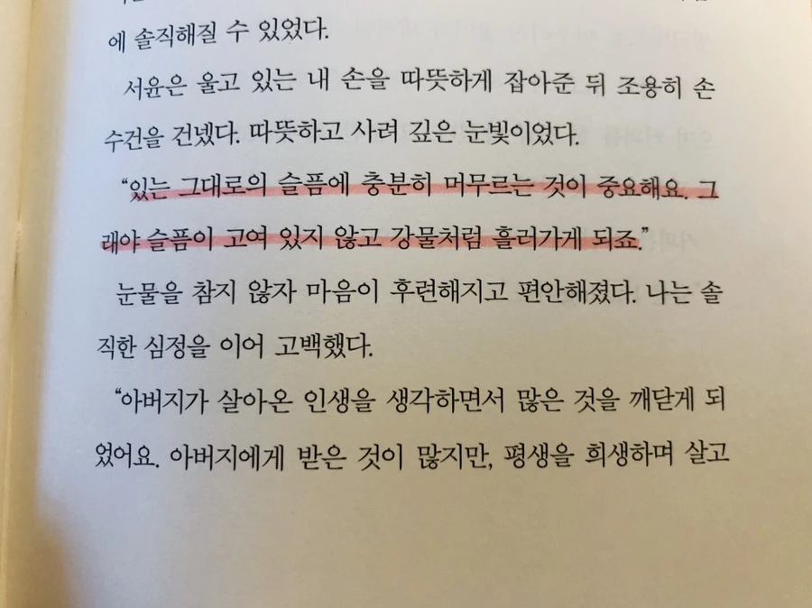 있는 그대로의 슬픔에 충분히 머무르는 것이 중요해요. 그래야 슬픔이 고여 있지 않고 강물처럼 흘러가게 되죠.