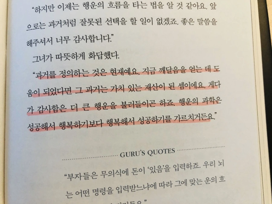과거를 정의하는 것은 현재예요. 지금 깨달음을 얻는 데 도움이 되었다면 그 과거는 가치 있는 재산이 된 셈이에요. 게다가 감사함은 더 큰 행운을 불러들이곤 하죠. 행운의 과학은 성공해서 행복하기보다 행복해서 성공하기를 가르치거든요.