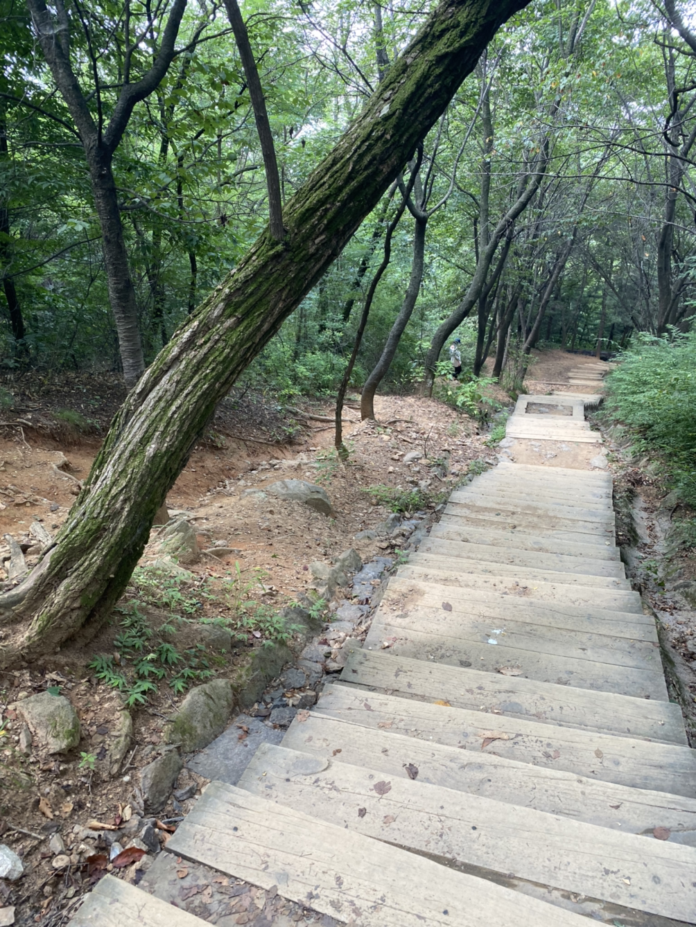 나이가 들어 제가 혼자 산에 오르게 되자 이번에도 같은 계단을 만나게 되었습니다. 처음에는 계단을 따라 걸었습니다. 하지만 여전히 아빠가 그러했듯 샛길로 많은 사람들이 다니는 것을 보고 어느 날은 저도 계단 옆의 오르막길을 올라보았습니다.