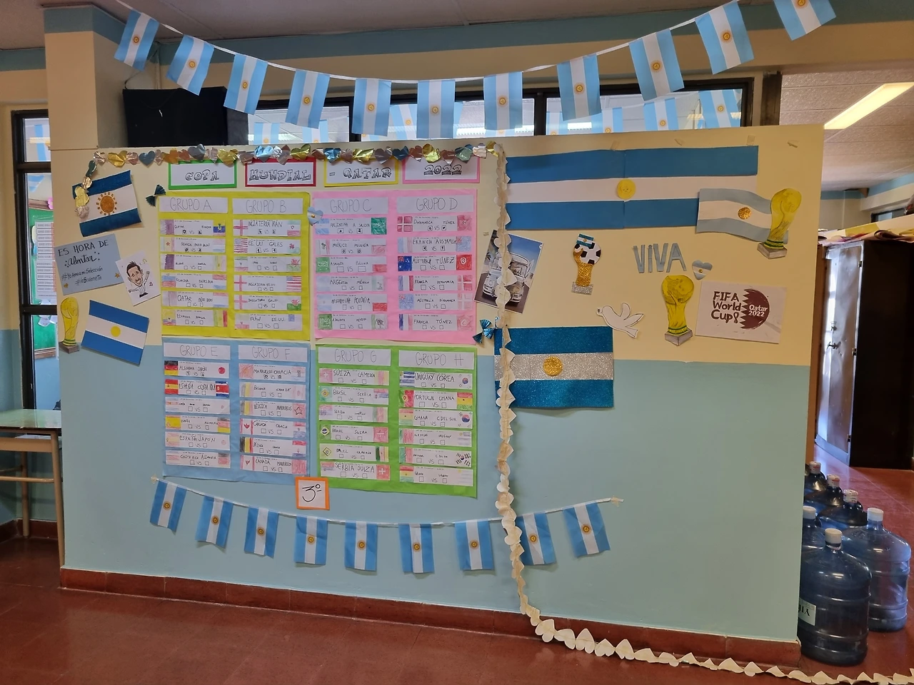 학교 벽 한쪽에 장식되어 있는 월드컵 참가 국가와 조별리그 스코어.
