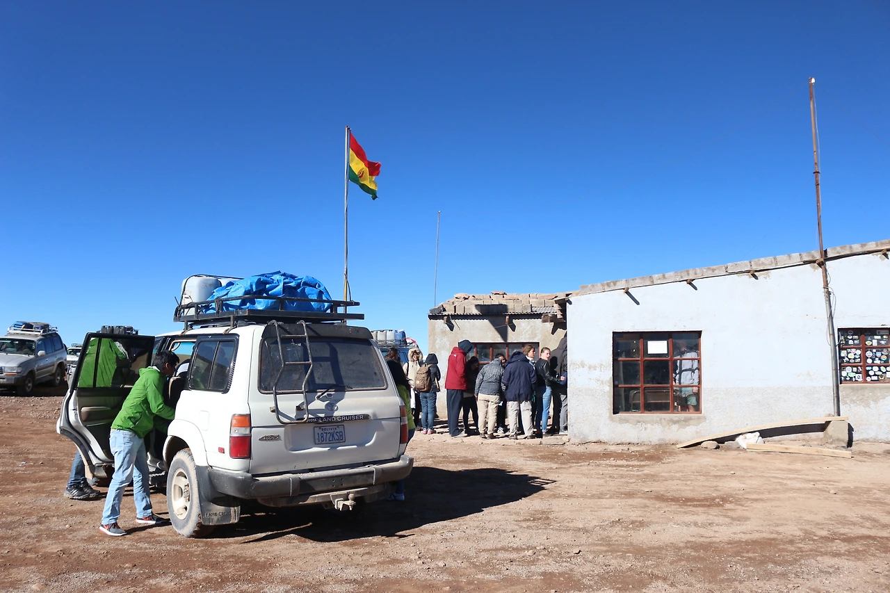 여행객들의 갖가지 짐을 위에 매달고 달리는 사륜구동차는 생각보다 작았지만 우리는 거기에 성인 여섯명이 낑겨 타야했다. 모두들 이 상황에 대해 말은 하지 않았지만, 살벌한 표정으로 기분을 바로 알 수 있었다. 그렇게 얼마간 달리고 나자, 황량하고 눈 덮인 고산 아래 충격적인 외관의 건물들이 몇 채 있었는데 , - 만약 “MIGRACIÓN BOLIVIA” 표시라도 없었다면 - 이곳이 국경 사무소인지, 버려진 창고인지, 혹은 공중 화장실인지 구분조차 어려울 만큼 낡고 초라했고, 그 모습을 본 우리 일행은 할 말을 잃었다.