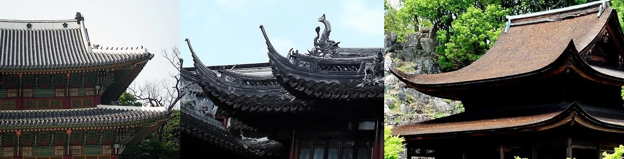 대표적인 생활양식인 의복과 건축은 그 시대의 조형미(造形美)를 공유한다. 건축은 생활공간이면서 기후의 영향을 받고, 사용하는 사람의 미적 취향이 드러난다. 동아시아 건축의 중요한 부분을 차지하는 것은 지붕이며, 지붕은 한중일 다른 특징을 갖고 있다. 한국 건축의 지붕은 견고하고 묵직하며 자연스러운 곡선을 갖고 있다. 지붕마루 양면에 회(灰)를 발라 마감하여 지붕라인인 더욱 선명하게 보이도록 한다. 중국 남부의 건축은 지붕 끝이 하늘로 급격히 올라가 춤을 추는 듯이 보인다. 특히 양자강 하류 원림건축에서는 눈창(嫩戧)을 이용하여 추녀 끝에 곡을 많이 주었다. 일본의 건축의 지붕은 평연(平椽)방식으로 제작되어 직선적이며 날카로운 끝부분을 갖고 있다.