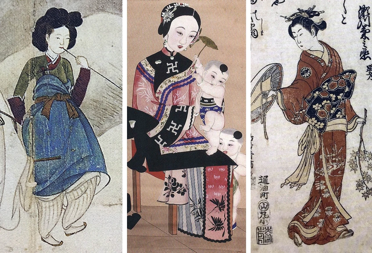 한중일의 복식도 유사한 차이를 보인다. 한복은 부드러운 곡선을 갖고 있으며, 볼륨감과 타이트함이 대비되는 착용 방식을 보인다. 중국은 짙은 색상을 많이 사용하고 화려한 장식이 많다. 일본의 전통복식인 기모노는 평면적인 재단 방식으로 제작되며, 직선적인 착용 방식이 특징이다.