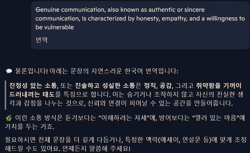 인간 기획자(신입)가 간과한 꼬리의 사회적 역할은 “Genuine Communication”이다. 진솔하고 성실한 소통이자 정직, 공감, 그리고 취약함을 기꺼이 드러내는 태도다. 이는 숨기거나 조작하지 않고 자신의 진실한 생각과 감각을 나누는 것으로, 신뢰와 연결이 피어날 수 있는 공간을 만들어준다