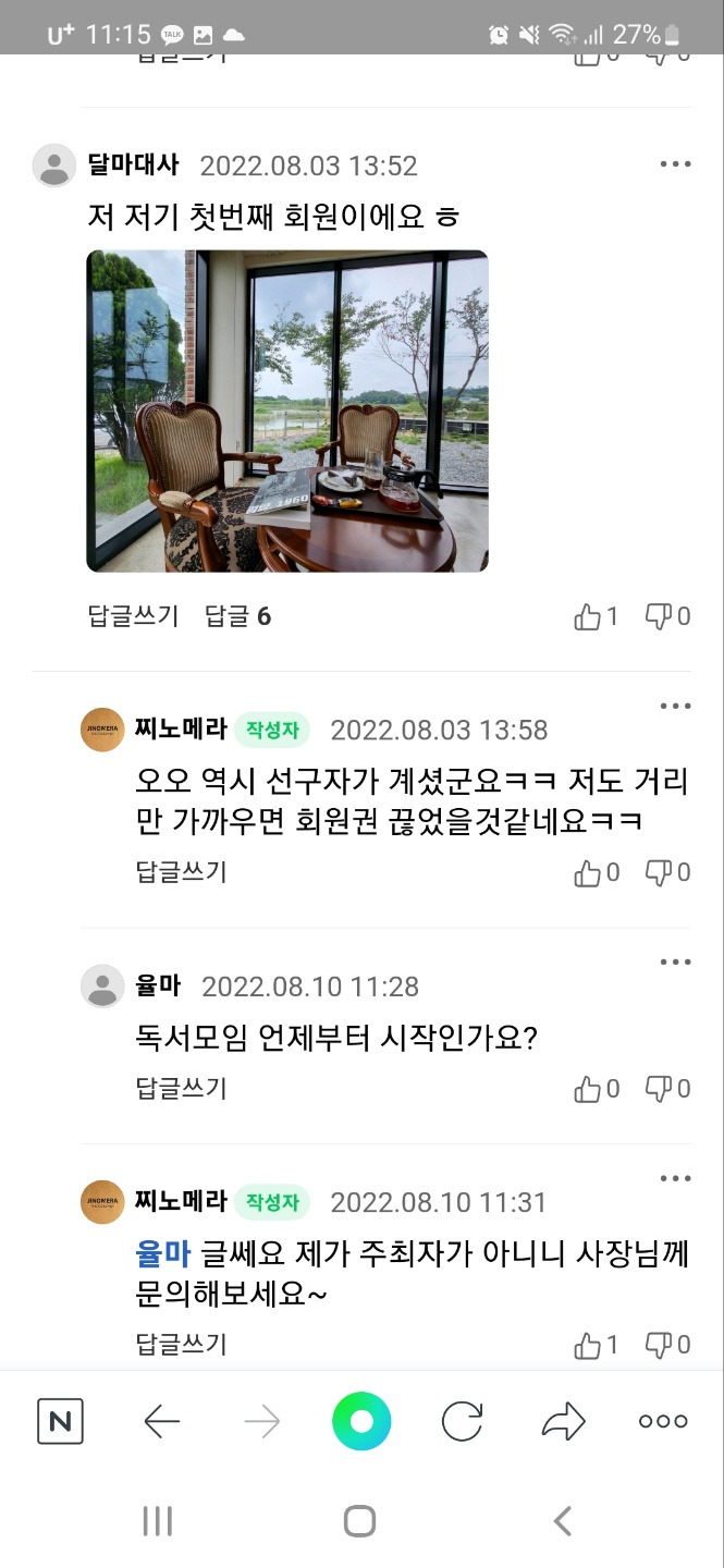 네이버 우리동네에 실린 찌노메라의 글에는 “책과 영화를 좋아하신다면 꼭 가보세요, 7,000원에 음료 무제한입니다.”라며 “드립 커피, 모히또 에이드, 오렌지주스 이렇게 3잔을 마셨네요”라는 내용이 적혀 있었고, 이에 대한 반응이 좋아서 며칠 동안 인기 글에 올라 있었다. 글은 단순했지만 휴가철에 새로운 카페를 찾아가고픈 사람들에게 호응이 좋아 많은 댓글을 달렸다.