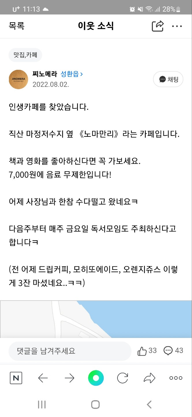 네이버에 “우리동네”라는 게 있는 줄 그때 처음 알았다. 그날 밤 네이버 우리동네를 뒤져 주말 동안 손님들이 밀려든 이유를 알아냈다. 8월 1일에 책방을 찾은 찌노메라라는 아이디를 쓰는 분이 그다음 날 네이버 “우리동네”와 당근마켓 “동네소식”, 이토렌트 등에 “인생 카페를 찾았습니다.”라는 글을 올렸던 것이다.