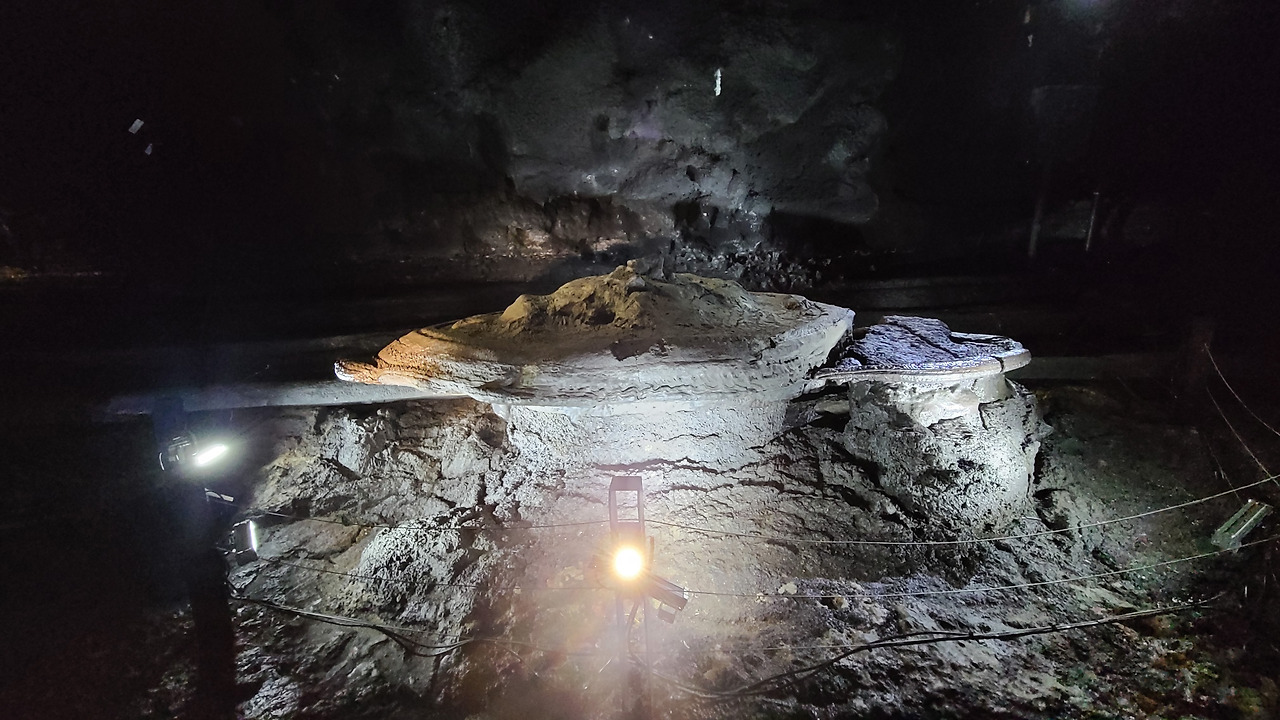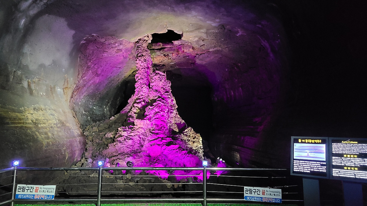 관람 구간의 끝엔 돌기둥이 하나 있는데 이게 바로 용암 석주이다. 이 석주의 높이가 7.6m 정도 되는데 형형색색의 조명을 받고 있어서 색깔이 계속 변한다.