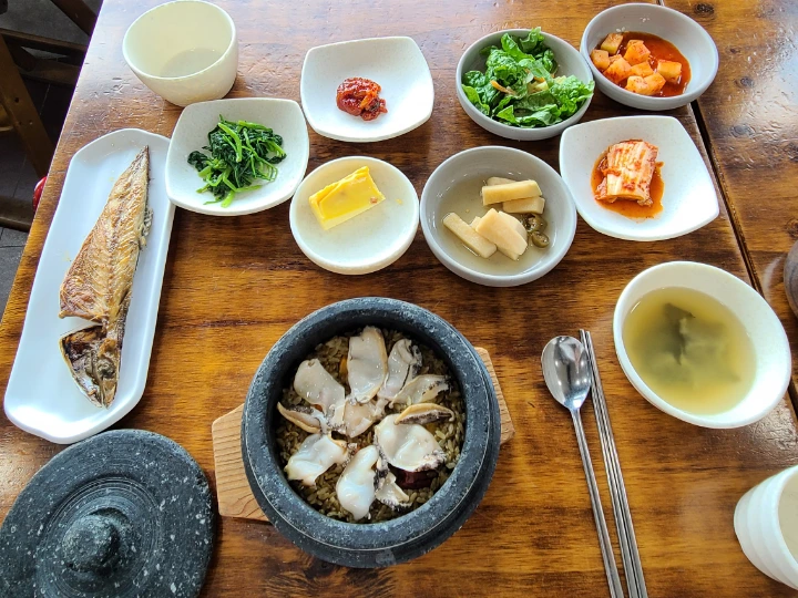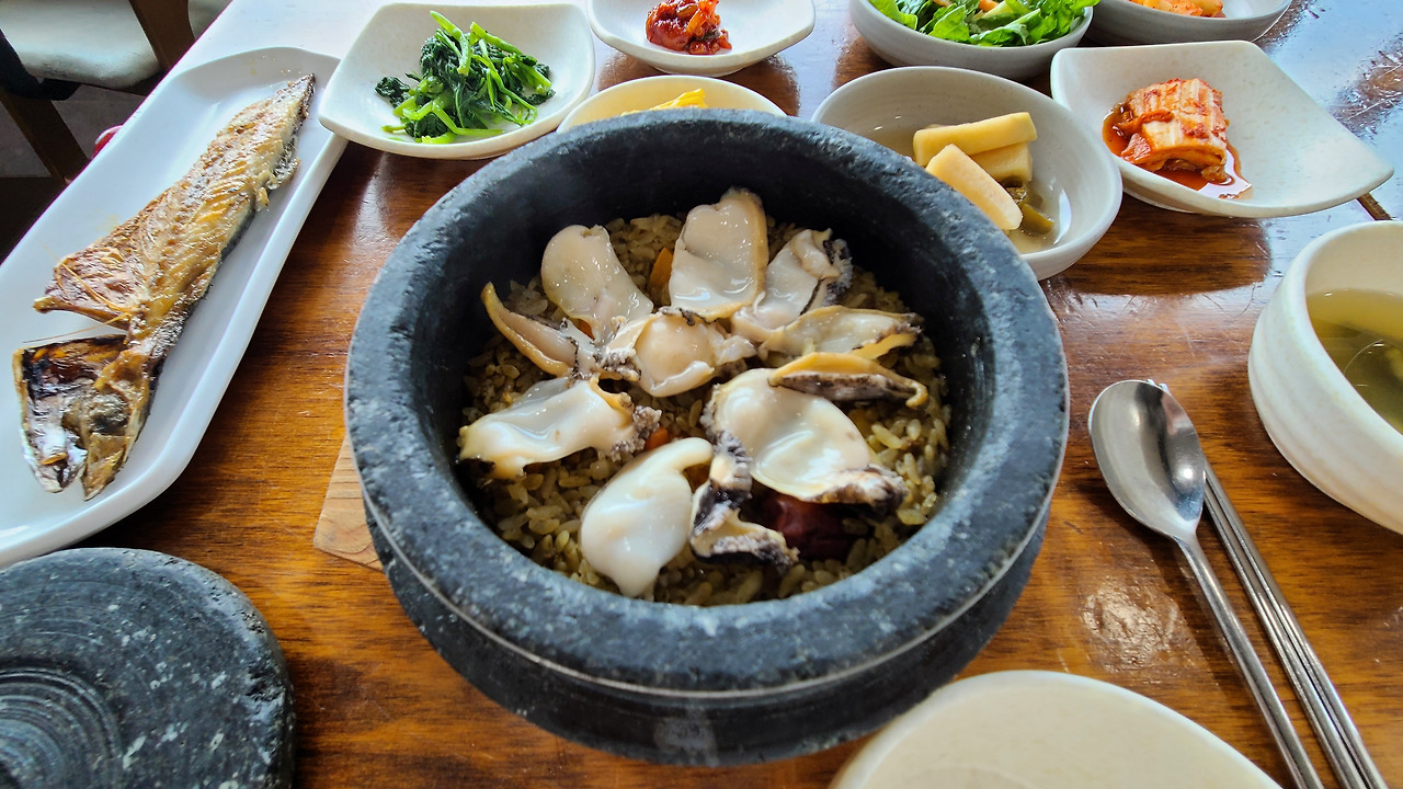 주메뉴는 전복돝솔밥과 전복구이다. 나는 전복돌솥밥을 주문하고 나오길 기다리는데 옆에 전복 구이 버터 냄새가 장난 아니다. 다음에 꼭 먹어보련다. 사장님이 서비스 고등어구이 반찬도 주셨다. '웬일이야. 나 오늘 생일인가 봐.'이런 느낌이었다.