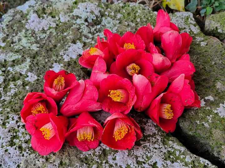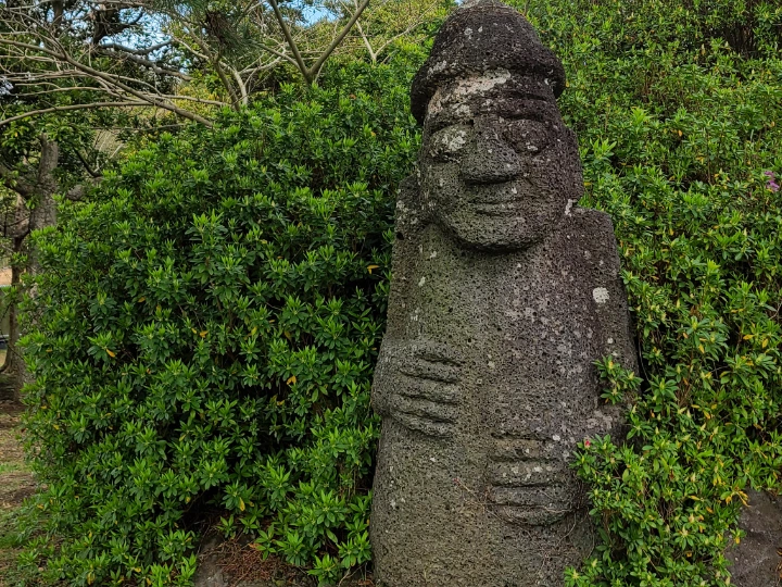 드디어, 나가는 곳에 도착했다. 동굴을 탐방하는 시간은 50분이 걸렸다. 거의 한 시간 만에 나온 바깥세상은 여전히 좋은 날씨였다. 아까 막 도착했을 때는 보지 못했던 만장굴 입구 주변에 꾸며 놓은 나무와 꽃, 조형물들이 이제야 보이기 시작했다. 12~2월에 와야 볼 수 있는 동백꽃도 누가 모아두었는지 돌 위에 예쁘게 모여져 있고, 제주의 상징인 돌하르방도 우뚝 서 있는 모습이 늠름하기만 하다. 정든 이곳을 뒤로하고 이제 늦은 점심을 먹으러 간다.