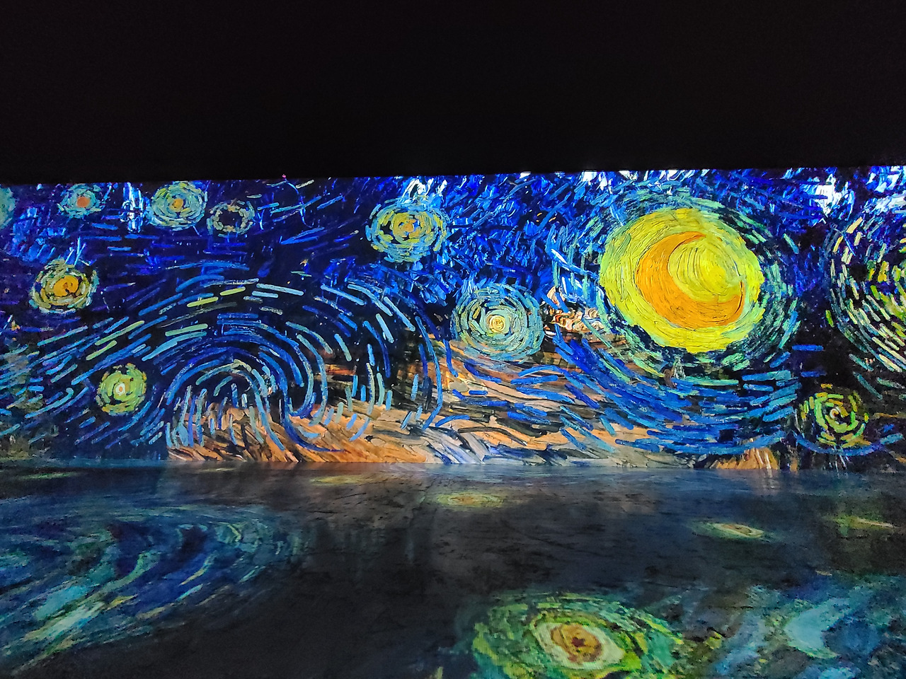 나는 가장 편하게 감상할 수 있는 자세를 찾았다. 벙커 가운데 기둥에 등을 대고 바닥에 앉은 채로 작품을 감상했다. 고흐의 인생 흐름에 따라 펼쳐지는 그림의 향연들에 내 눈과 귀가 준비되지 않은 상태로 빼앗겨 버렸다. 작품을 다 보는 데 30분이 소요되는데, 단지 한 번만 볼 수 없어서 그 자리에 그대로 앉아 1시간을 내리 보았다. 하루 종일 앉아서 볼 수 있을 거 같다는 생각이 들만큼 황홀한 기분이 드는 전시였다.
