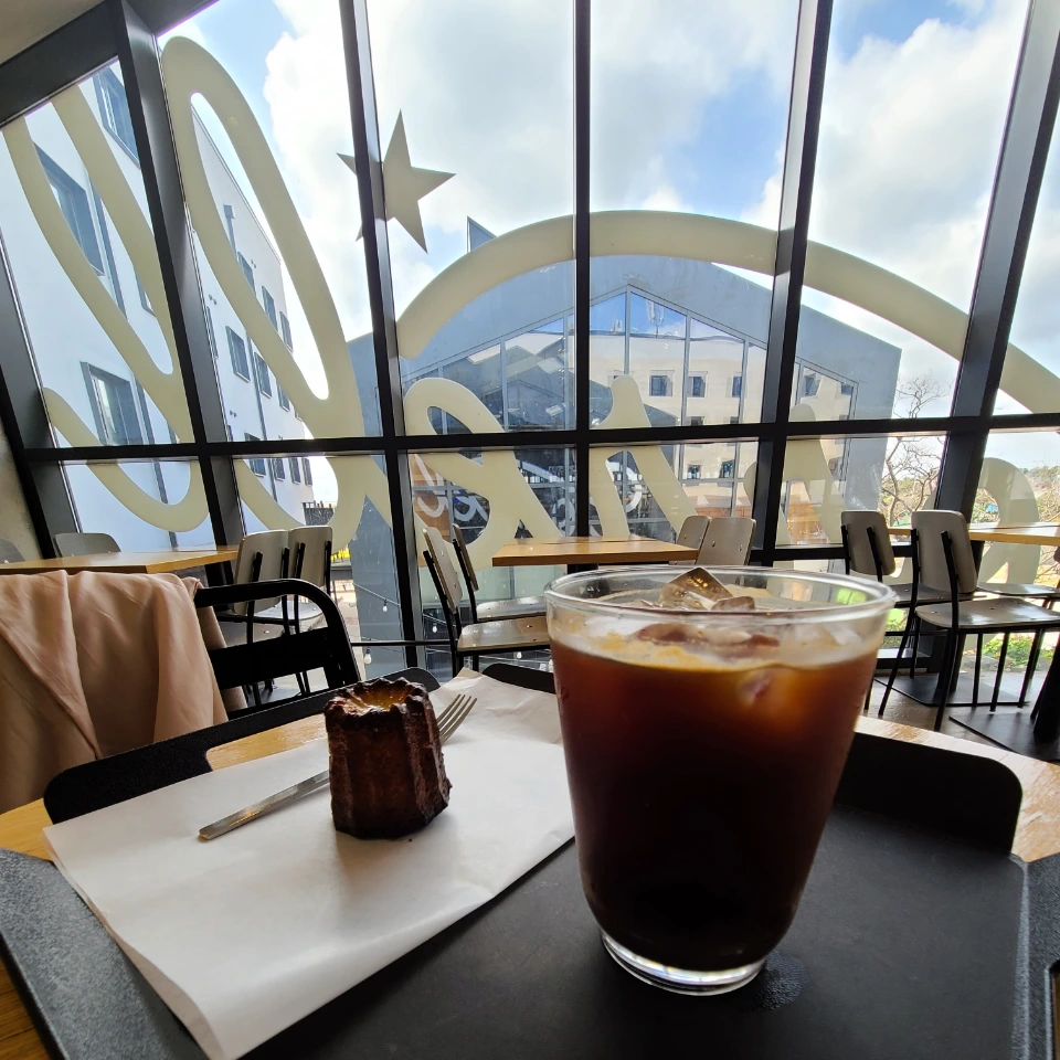 아메리카노 한 잔과, 까눌레 하나를 주문했다. 커피는 깊이 있는 맛이, 까눌레는 겉은 바삭하고 속은 촉촉한 클래식한 맛이 일품이다. 아침 제주가 보이는 창가에 앉아서 차창 밖을 바라보며 요가의 여운을 간직하고 생각 일지를 써보며 조용한 여유를 즐길 수 있는 최적의 장소였다.