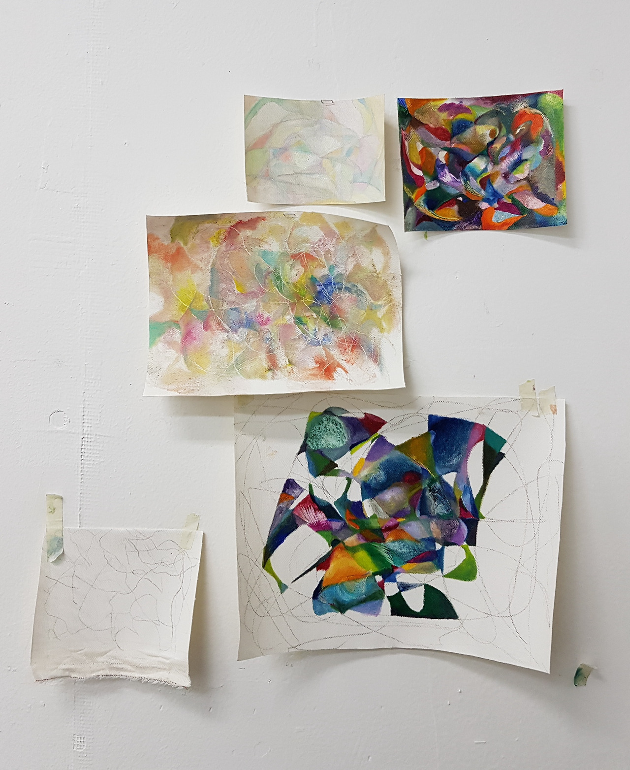 바로 캔버스 작업을 시작하지 못해서, 교수님과의 1차 면담 전까지 천을 작게 잘라 에스키스를 여러 개 그려냈다. 마구잡이로 선을 겹치게 그리고, 그 안에 색을 채우는 작업이 주였다. 그러다가도 이후에 뭘 더 해야 할지 몰라, 조금 그리다 멈춰 서고 다시 색을 채우다 멈춰 섰다. 당연스레 작업 속도가 더뎠고 그걸 나도 알아 답답했다.