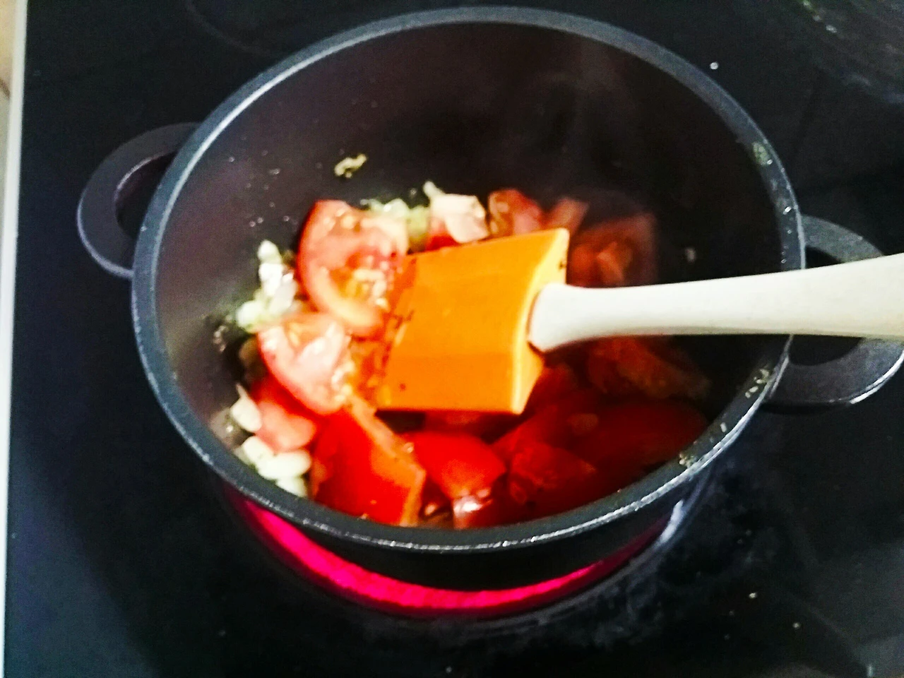 1. 완숙토마토 1개와 양파1/4개 큐브썰어 올리브오일에 소금 한 꼬집 후추약간 넣고(안넣어두 괜찮은편) 볶아요.
