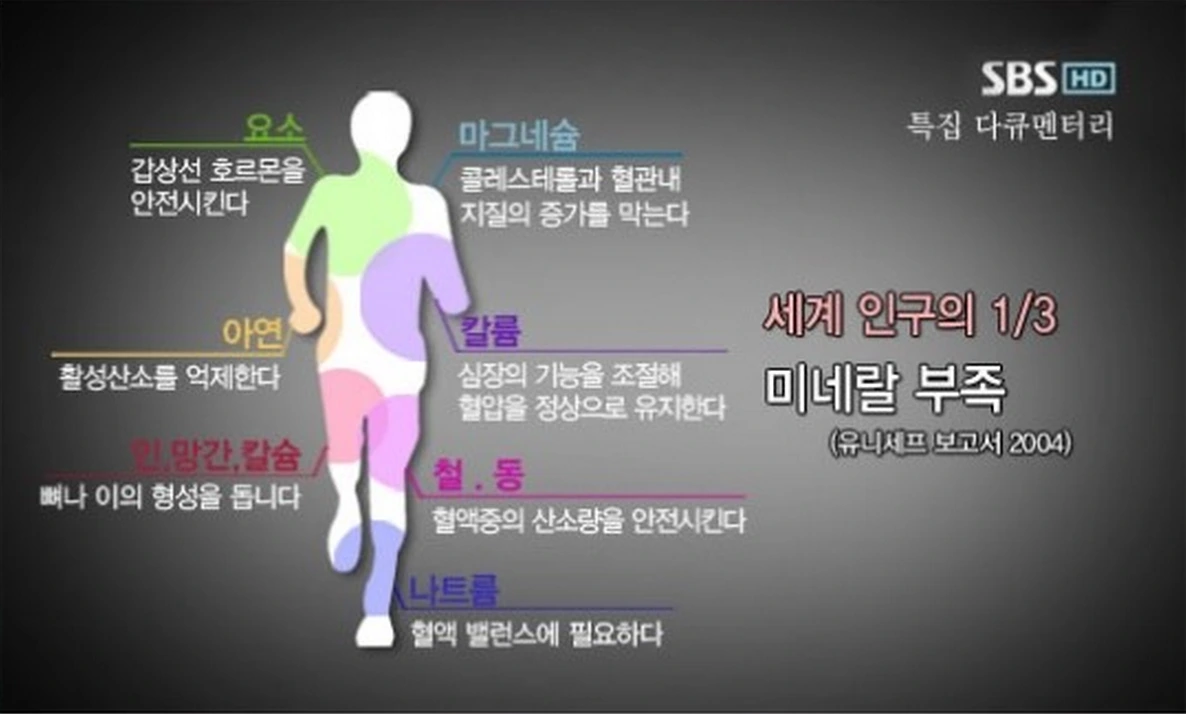 미네랄은 우리몸의 약 4%정도 그 비중은 작아도, 어릴 때 부터 배웠던 우리몸의 필수 5대 영양소 중에 하나일 정도로 신체 대사에 꼭 필요한 성분입니다. 4가지 영양소를 모두 챙기더라도 소량이 필요한 미네랄이 부족하다면 영양소가 제대로 작동을 하지 못하는 것이지요. 생명 유지를 위해 필요한 미네랄은 그 양은 조금씩 필요하지만 무려 16가지 정도 된다고 합니다. 하루 100mg이상이 필요한 주요 미네랄에는 칼슘, 칼륨, 마그네슘, 나트륨, 인,황, 염소가 있고, 100mg미만이 필요하지만 철,아연, 구리,망간, 요오드, 셀레늄, 몰리브겐, 코발트, 크롬이 있다고 합니다. 주요 미네랄 중 마그네슘은 아시다시피 우리는 이미 짭잘한 반찬속에서 하루 섭취량을 상회해 섭취하고 있지만, 나트륨을 조절하고 세포 내 가장 많은 비중을 차지하는 칼륨, 뼈와 근육의 구성에 중요한 역할을 하는 마그네슘과 칼슘은 잘 챙기기가 어렵지요.
