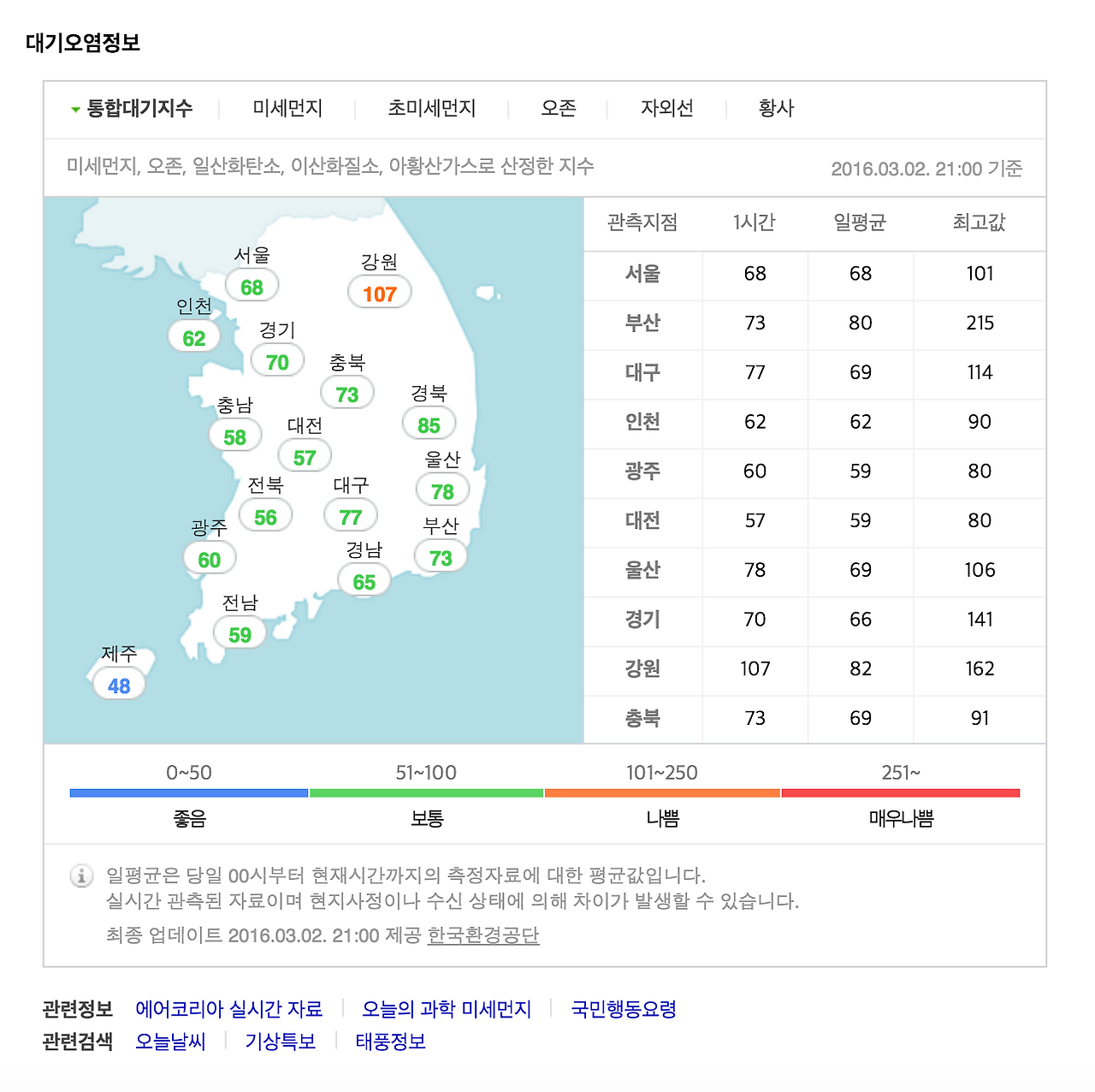 6가지 대기오염 물질이 많은건 알겠는데, 각각 그것에 따라 어떻게 대응을 해야 하나. 전문가가 아니라면 막막한데요, 에어코리아를 통해 발표되는 '통합대기지수'를 참고하면 6가지를 모두 다 보지 않아도 된다고 하네요.