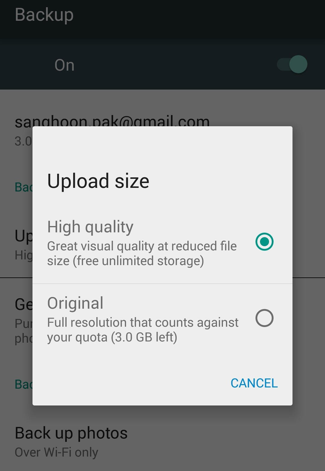 마지막으로 클라우드 서비스 중에서 사진을 많이 가지고 계시는 분들께 꼭 권해 드리고 싶은 서비스가 하나 있습니다. 구글Photo입니다. 구글 포토가 제공하는 기능 중 가장 위력적인 기능이 하나 있습니다. 구글은 1600만 화소 이하의 사진, 풀HD 이하의 영상에 대해 용량을 무제한으로 제공하고 있습니다. 이만하면 DSLR 카메라를 제외하고는 무한으로 사진을 담을 수 있는 서비스입니다. 사용방법도 간단합니다. 스마트폰에 구글 포토 APP을 깔아준 이후에 동기화만 설정을 해 주시면 됩니다. 핸드폰에 몇 장의 사진을 찍던지 무제한으로 사진을 저장할 수 있습니다. 다만 아래의 사진과 같이 사진의 Quality를 Original이 아닌 High Quality로만 설정해 주시면 됩니다.