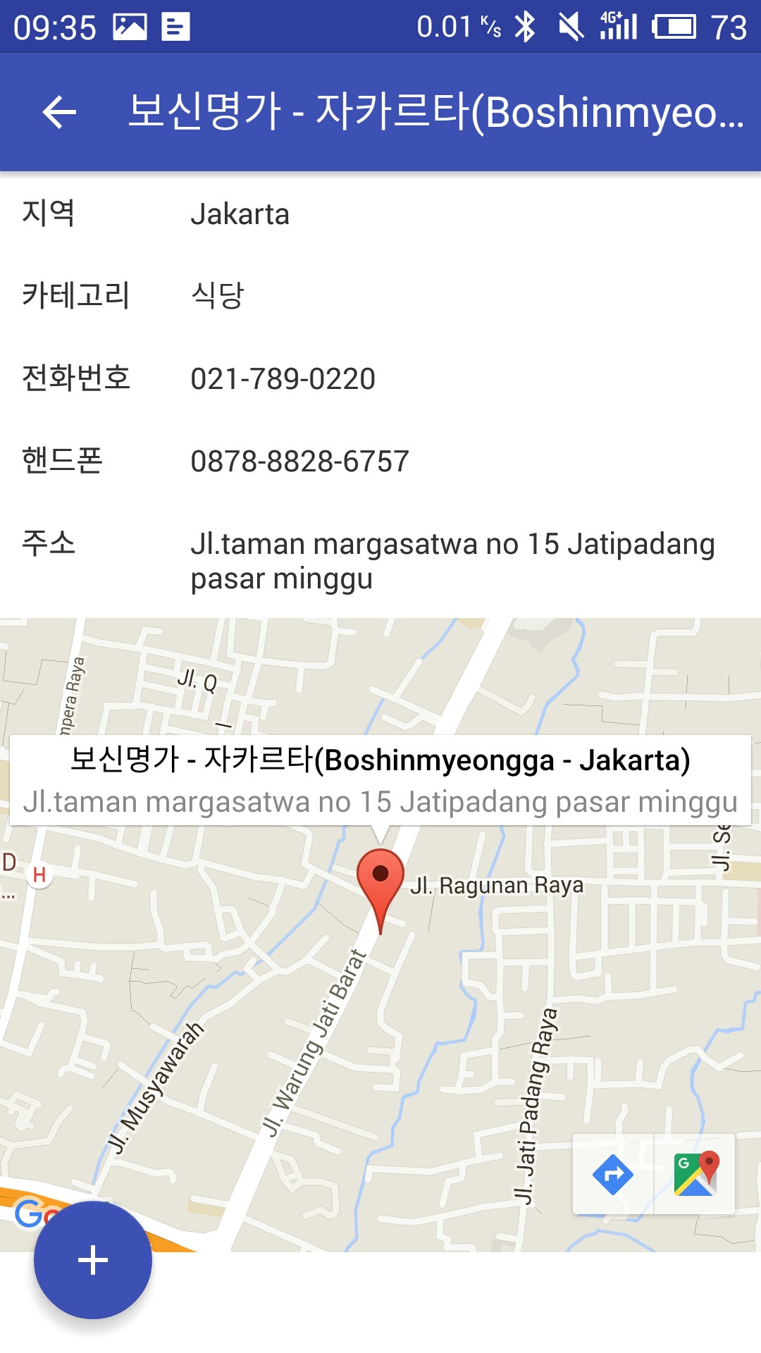 특히 인도웹의 APP에는 인도웹114라는 교민들이 자주 이용하는 식당이나 각종 편의시설과 주요 기관의 연락처뿐 아니라 상세 페이지에서는 구글맵으로 위치까지 직접 확인할 수 있는 서비스를 제공합니다. 교민뿐 아니라 출장자나 인니 여행하시는 분들에게도 유용할 듯합니다. 아래의 화면에서 보시는 것처럼 제가 자주 가는 한국식당의 전화번호뿐 아니라 위치까지 정확하게 볼 수 있습니다. 빨간색 표시된 지점을 누르면 구글맵으로 직접 연결할 수 있는 버튼도 보입니다. 편리하게 원하는 곳을 정확히 찾아갈 수 있는 서비스를 제공합니다.