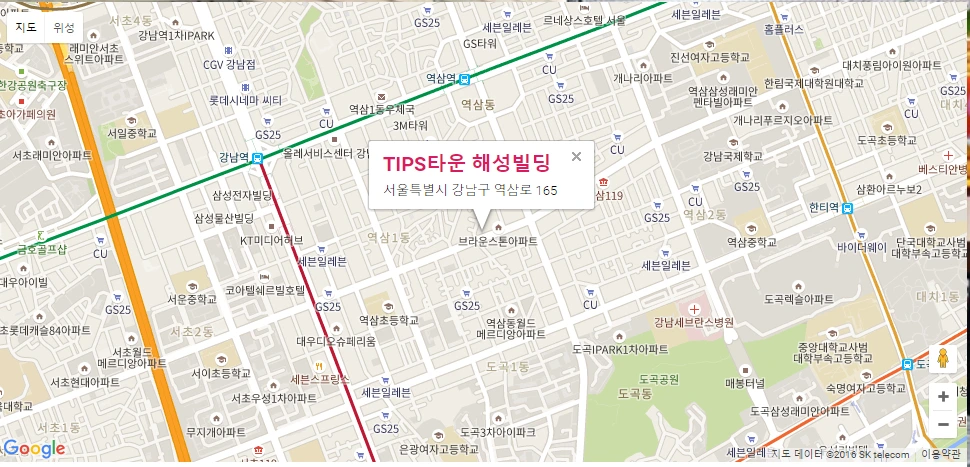 정확한 주소는 서울특별시 강남구 역삼로 165 해성빌딩 팁스타운(TIPS TOWN) B1F TIPS HALL 이며, 상세한 주소는 아래 지도를 참조하시기 바랍니다.