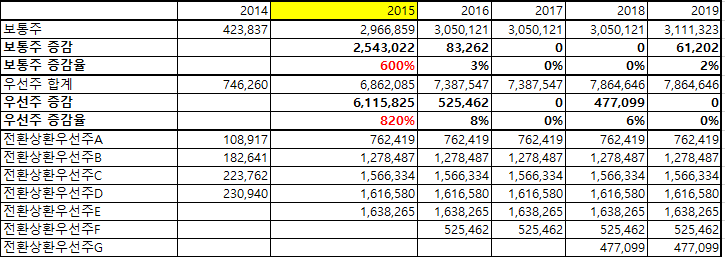 2015년의 대규모 투자 후, 2016년, 2018년 보통주와 우선주가 증가하긴 했지만 주식 총 수는 크게 증가하지 않았습니다.