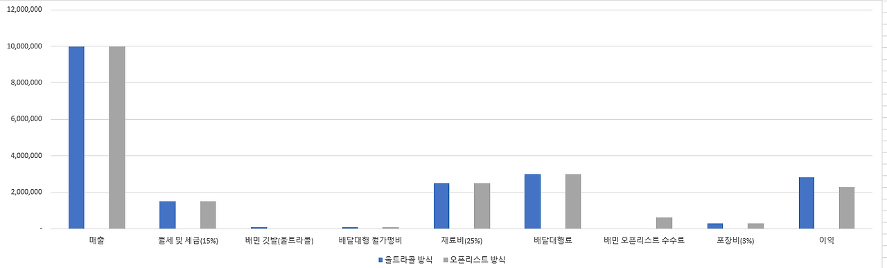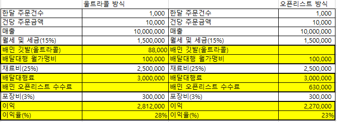 일단 배달만 하는 가게의 이익을 울트라콜(기존 방식), 오픈리스트(신규 방식) 때 어떻게 바뀌는 지 보겠습니다.