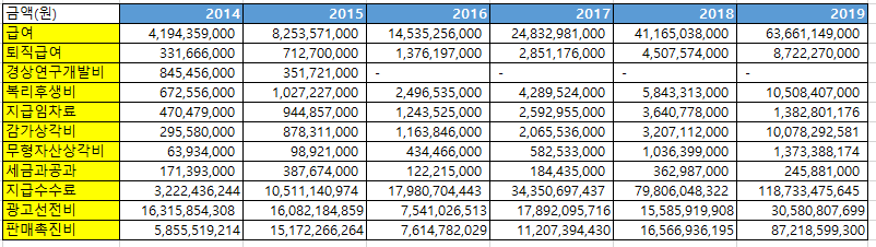2014년에서 2019년까지(2019년 감사보고서는 2020년 4월에 나왔으니 따뜻한 최근 보고서 입니다. 기업의 2018년, 2019년 연간 실적은 보통 4월 초에 연간 보고서가 나옵니다).