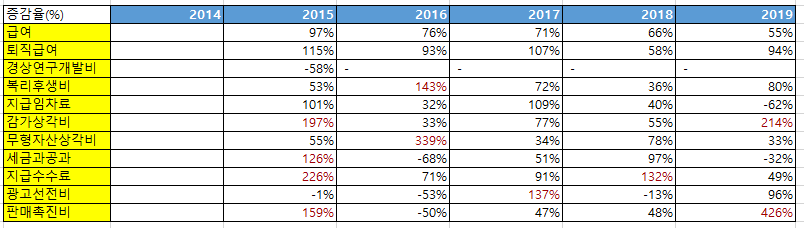 중요한 건 2018년에서 2019년으로 바뀌면서 2019년 감사보고서에 기재된 2018년의 비용내역과 2018년 감사보고서에 기재된 비용내역이 상이한 경우가 있습니다. 아마 회계처리 기준이 바뀐 것 같습니다.