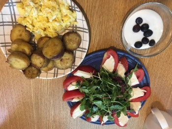 아침에 먹는 스크램블 에그와 토마토에 치즈, 당이 첨가되지 않은 요거트에 블루베리 그리고 마지막으로 고구마를 버터로 구운 것은 사실 LCHF(Low Carbohydrate High Fat)과 어울리지 않은 메뉴이나 이건 내가 먹는게 아닌 다른 분이 드시는 것이므로 패스