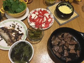 코스트코에서 사온 갈비살과 계란찜, 아침에도 활용한 토마토위에 생치즈, 그리고 고등어와 야채. 마지막으로 방점을 찍어주는 건 버터를 넣은 미역국. 여러분 미역국에 버터를 넣어먹으면 생각보다 아주아주 고소합니다. LCHF 식이요법을 드시는 분께 한 번 추천 드립니다