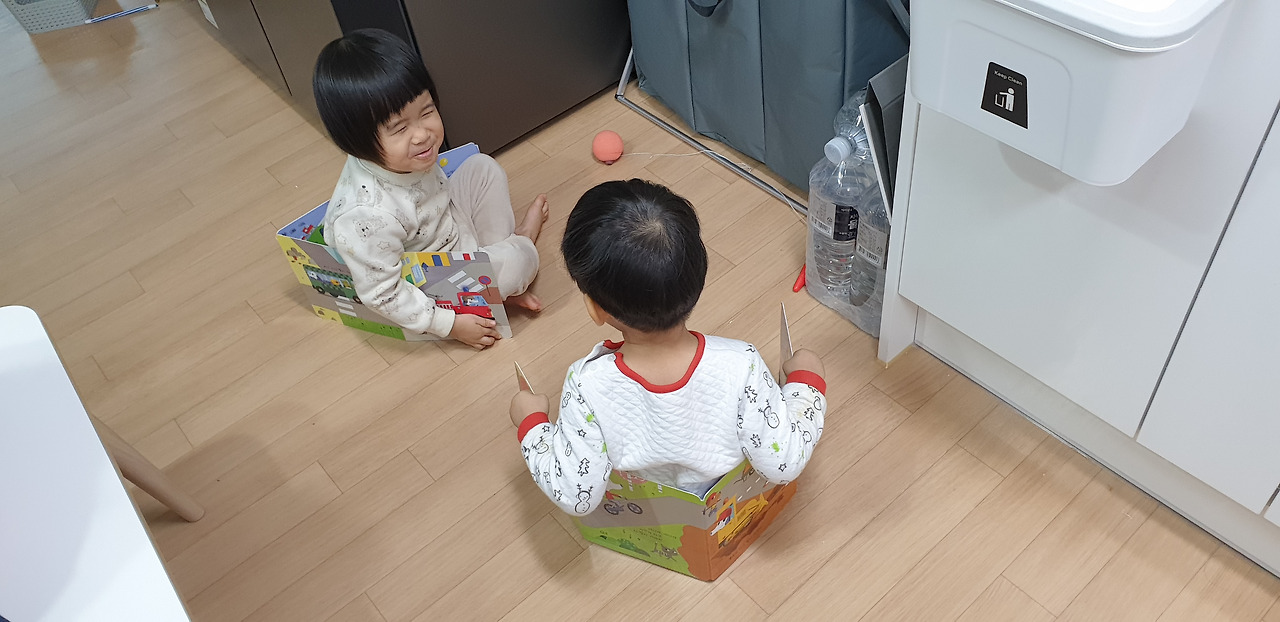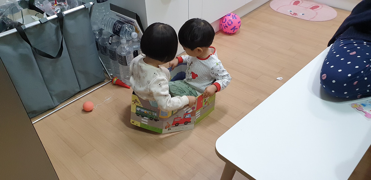 각자 찢어진 책을 한 권씩 가지고 놀던 주하와 주호도 서로의 책을 붙여 하나의 동그라미 안에 들어가 놉니다. 동화책 속의 꿀벌과 파리를 보는 것 같습니다.