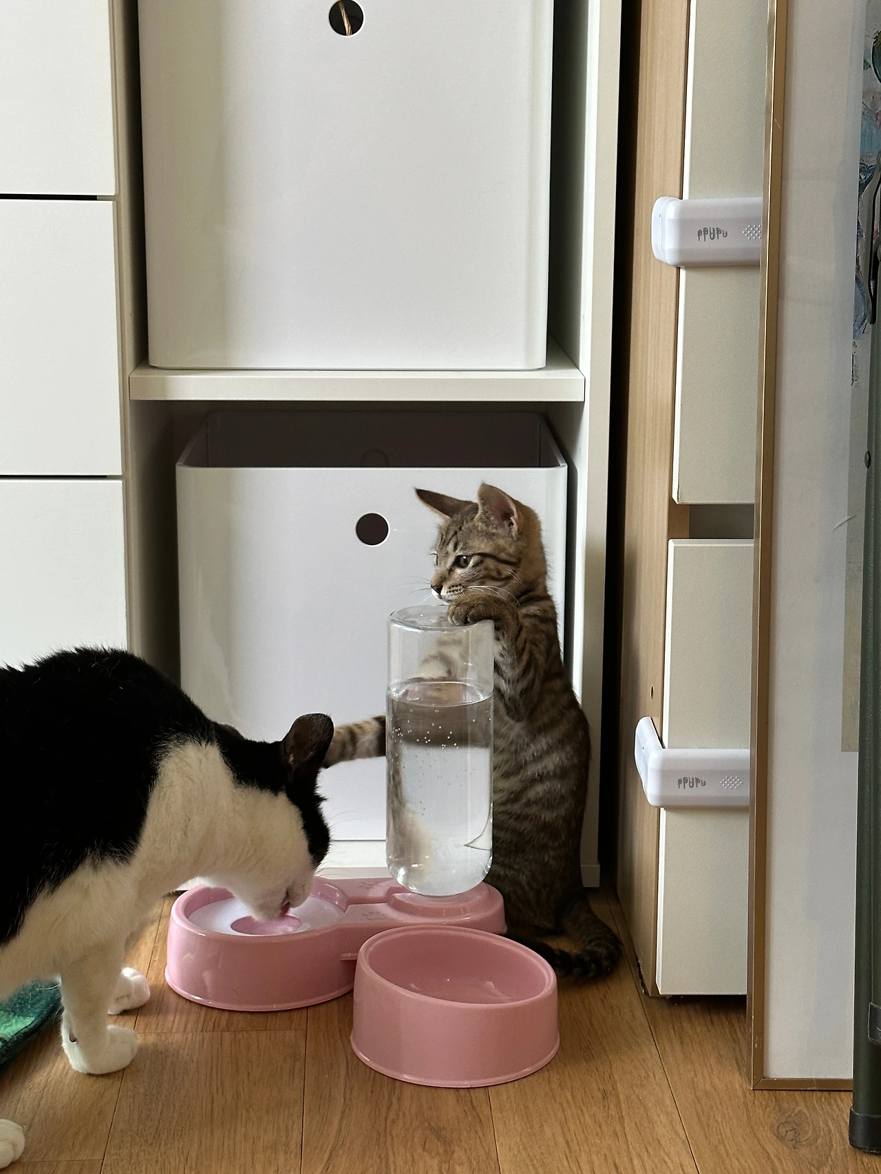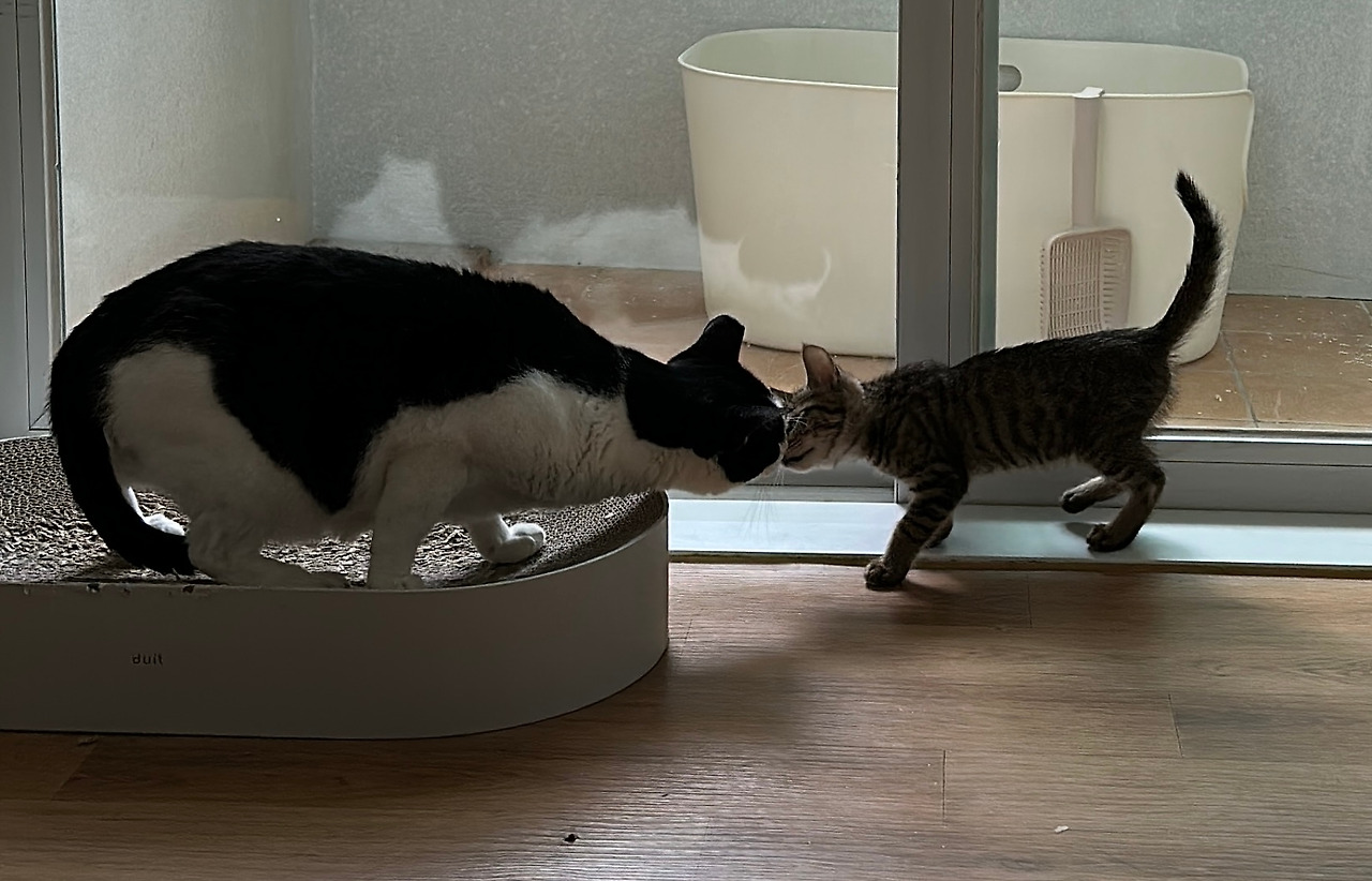 그러면 이제 하나 남은 따루와의 관계다. 따루는 아직 우리와도 거리 두기를 좁히지 못한 친구다. 구조하기 전에 지인이 이야기하길 같은 고양이 친구들과는 잘 지내는 편이라 했다. 하지만 선천적으로 고양이는 영역 동물이며 낯선 존재에게 우선 경계하는 게 일반적인 상식이다. 그래서 우린 아깽이와 따루의 합사 속도를 아주 천천히 가져갔다. 장애물을 두고 거리를 두어 천천히 서로 냄새를 맡는 것부터 시작했다. 서로 부정적으로 경계하거나 회피하지 않으면 단계적으로 가까워지게 할 셈이었다.