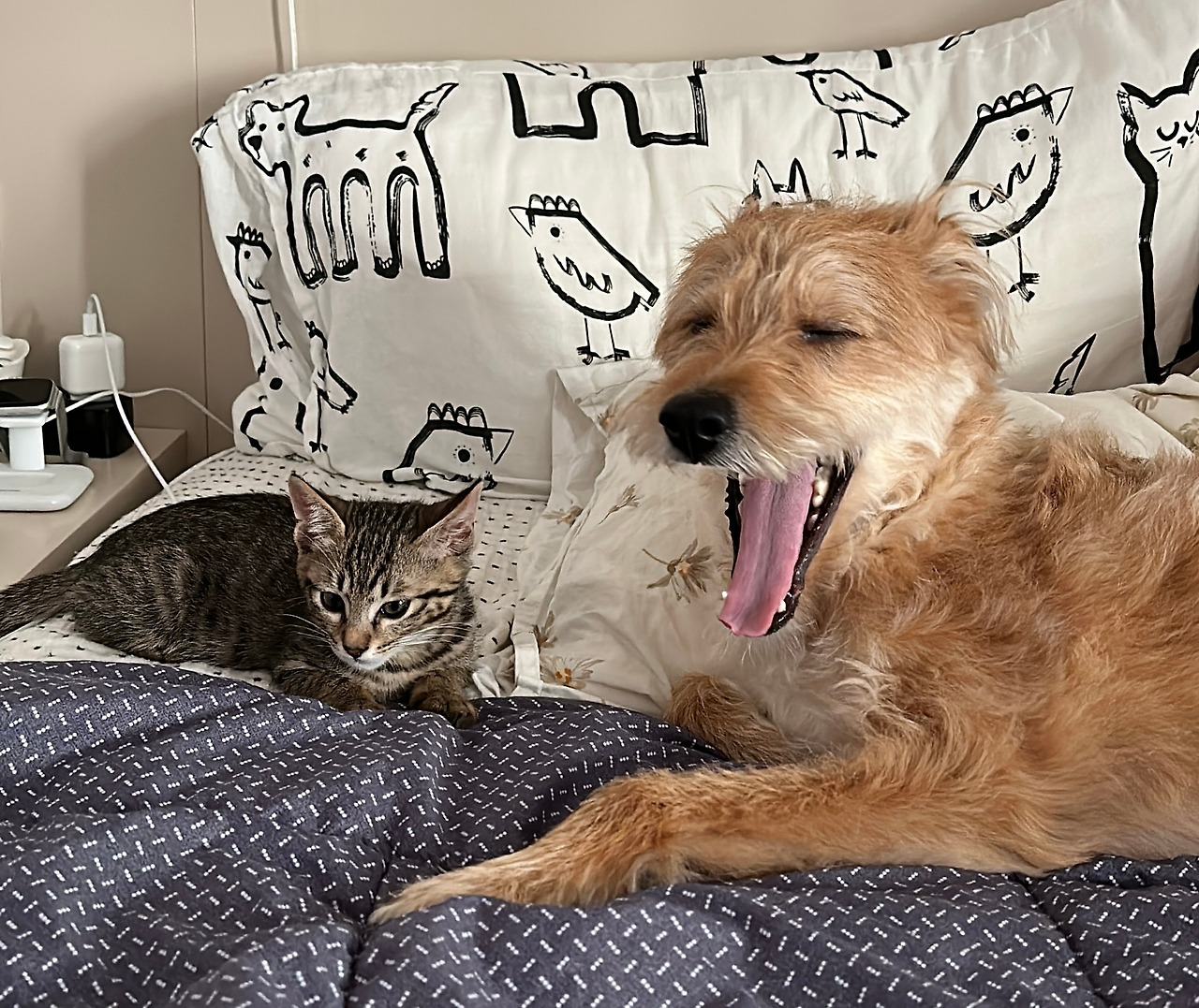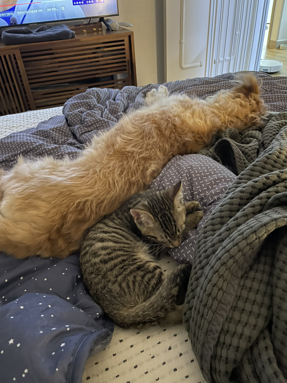우리 집엔 6월부터 함께 한 아깽이인 따랑이가 있다. 그리고 아깽이 위엔 따리라는 멈머와 따루라는 스트릿 출신 냥이가 있다. 처음엔 우려가 많았다. 혹시나 잘 지내지 못하면 어쩌지. 그럴 땐 어떻게 해야 할까라는 수 만 가지의 시나리오를 생각하며 플랜 BtoZ를 생각해 봤다. 그리고 대비를 했다. 격리를 위한 울타리를 구매하고, 대피할 수 있는 캣타워를 준비하고, 유튜브를 보며 합사 노하우를 따라 하고. 하지만 이 모든 걸 무색하게 하는 상황이 펼쳐졌다. 따랑이가 처음 집에 오고 따리를 처음 만났을 때, 하찮은 하악을 몇 번 할 뿐 그들은 예상보다 일찍 친구이자 가족이 되어 버렸다.