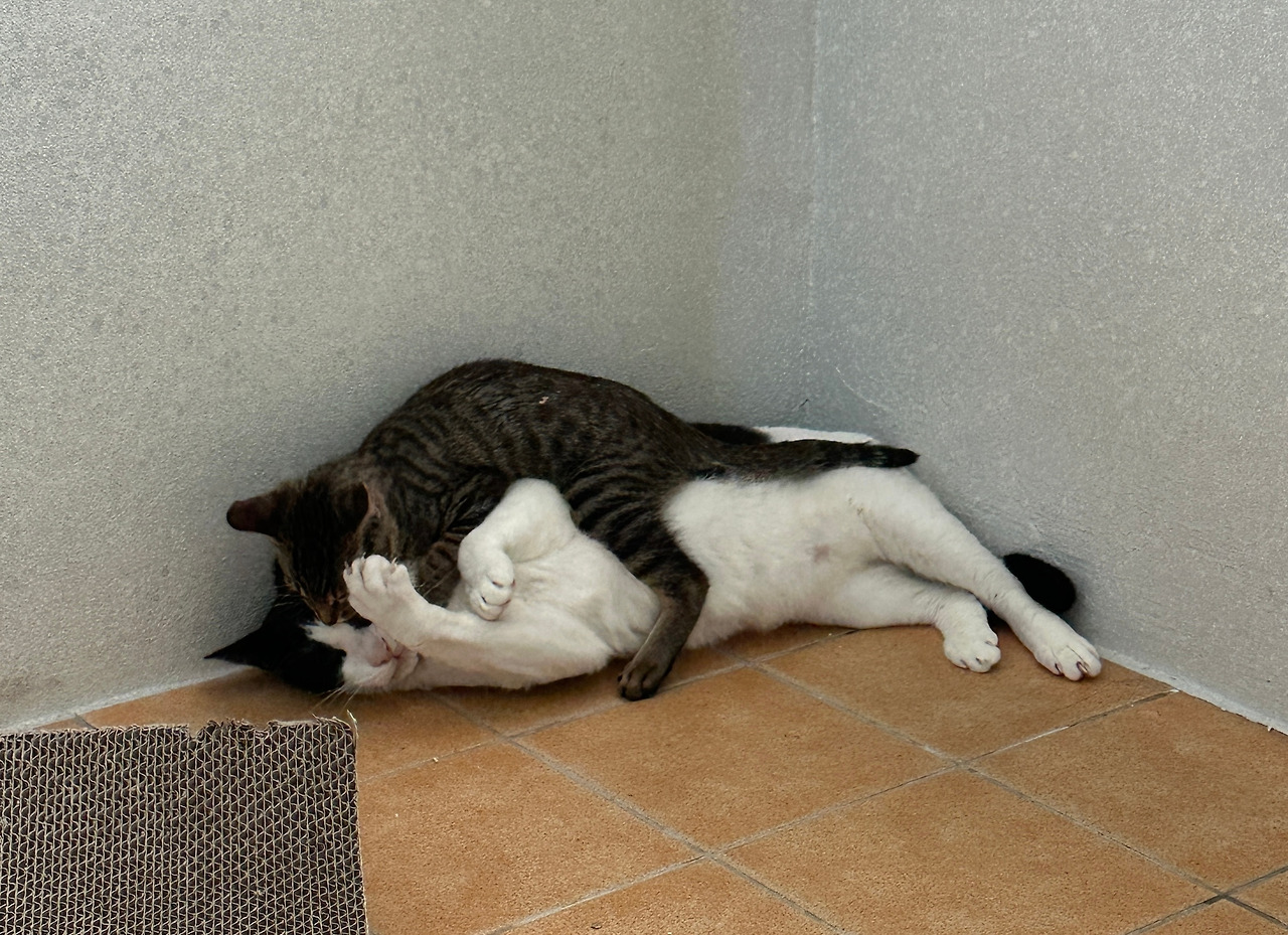 같은 냥이들은 몸싸움을 하며 논다고 한다. 서로 때리거나 예민한 소리를 내는 것이 아니라 마치 싸우는 것처럼 보이지만 안고 물고 넘어지며 노는 것이 오히려 즐거움의 표현이라고 미야옹철 선생님이 그랬다. 그래서 따루랑의 모습을 아주 유심히 관찰했다. 혹시나 다치진 않을까 했지만 이들은 알로그루밍을 하며 서로 좋아하는 모습을 많이 보여줬다.