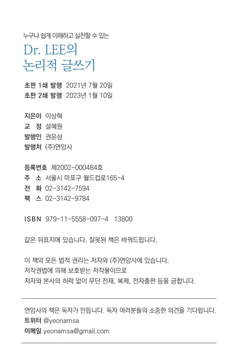 책이 출간된지 약 1년 6개월이 지나는 내년 1월에 <Dr. LEE의 논리적 글쓰기> 2쇄가 발행될 예정입니다. 베스트셀러가 되지 못한 아쉬움이 무척 크지만, '논리적 글쓰기'에 목말라 하는 소수 독자들의 꾸준한 요구가 있기에 감사하게도 2쇄를 발행하게 되었습니다.