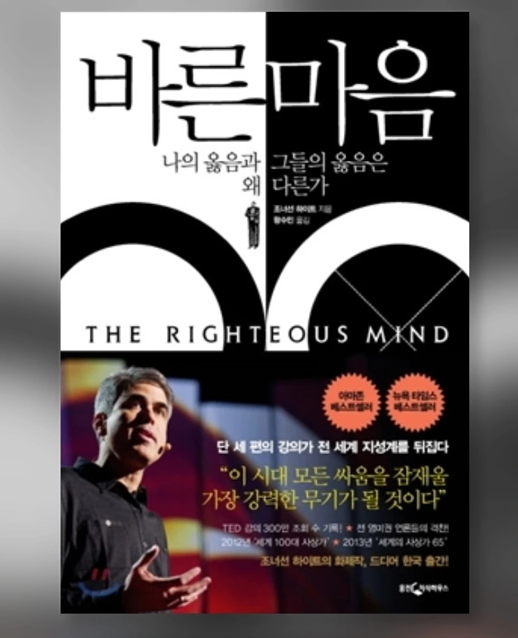 <바른 마음: 나의 옳음과 그들의 옳음은 왜 다른가> (웅진지식하우스, 2014)라는 번역본도 이미 출간되어 있습니다. 다만, 지나친 의역으로 인해 Jonathan Haidt 교수가 전달하고자 하는 원문 표현의 맛과 멋이 상당 부분 훼손된 것 같아, 아쉬움이 있습니다.